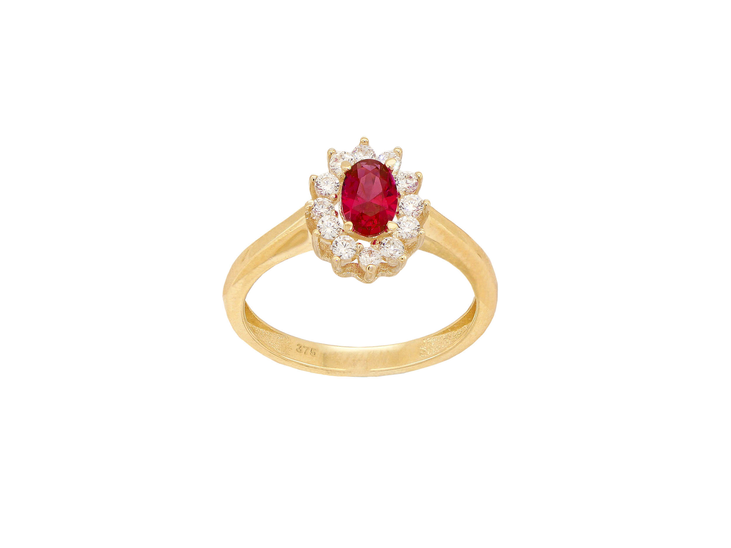 Χρυσό δαχτυλίδι οβάλ ροζέτα 9 Καρατίων. Κοσμείται με μια κεντρική κόκκινη πέτρα ζιργκόν και με λαμπερές cubic ζιργκόν πέτρες σε λευκό χρώμα περιμετρικά. Ένα κομψό και διαχρονικό κόσμημα για κάθε περίσταση.