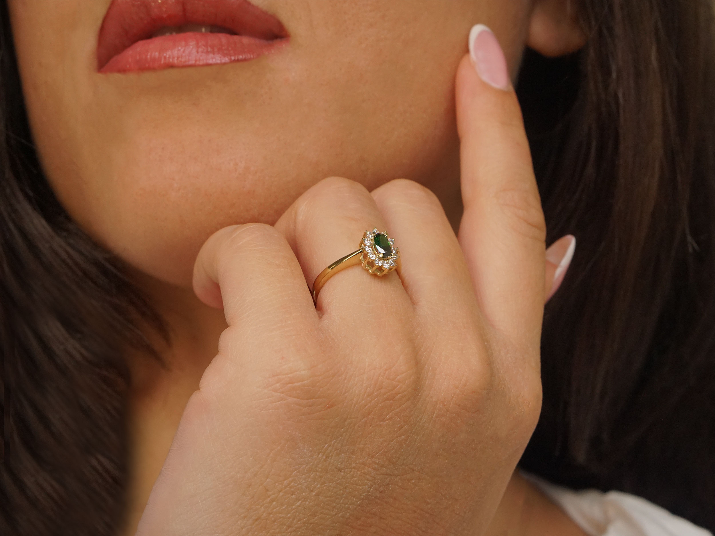 Χρυσό δαχτυλίδι με οβάλ ροζέτα 9 Καρατίων, διακοσμημένο με μια εντυπωσιακή πράσινη πέτρα ζιργκόν. Η κεντρική πέτρα περιβάλλεται από μικρότερες, λαμπερές cubic ζιργκόν πέτρες σε λευκό χρώμα. Το ιδανικό δώρο για να γιορτάσετε μια ξεχωριστή στιγμή ή για να προσθέσετε μια δόση πολυτέλειας στις εμφανίσεις σας.