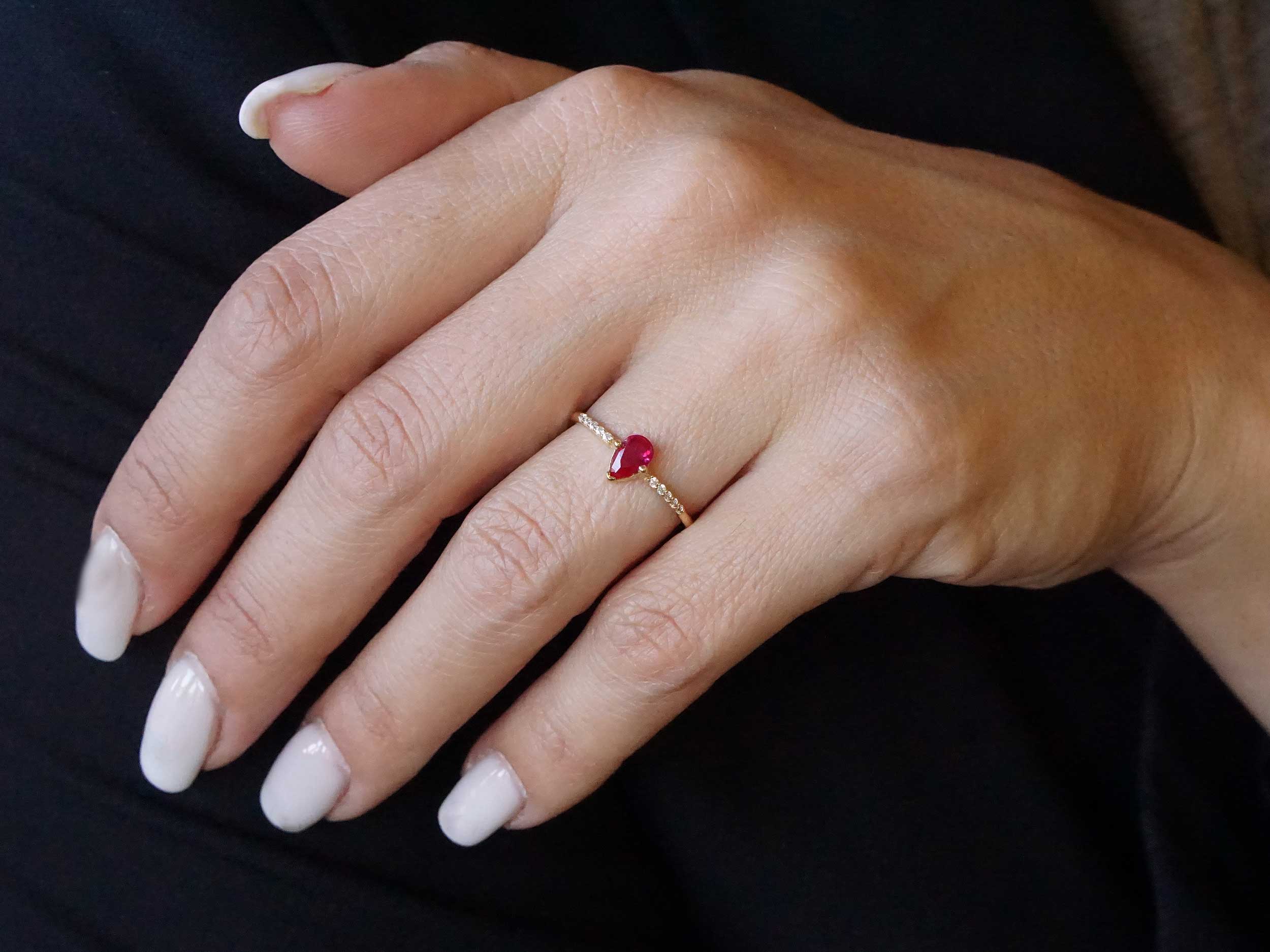 Δαχτυλίδι με πέτρα δάκρυ, σε χρυσό 8 Καρατίων. Κοσμείται με μια κεντρική κόκκινη πέτρα ζιργκόν drop και με λευκές cubic ζιργκόν πέτρες στη γάμπα του. Ένα κόσμημα που θα προσθέσει μια χρωματιστή και κομψή πινελιά σε κάθε σας εμφάνιση.