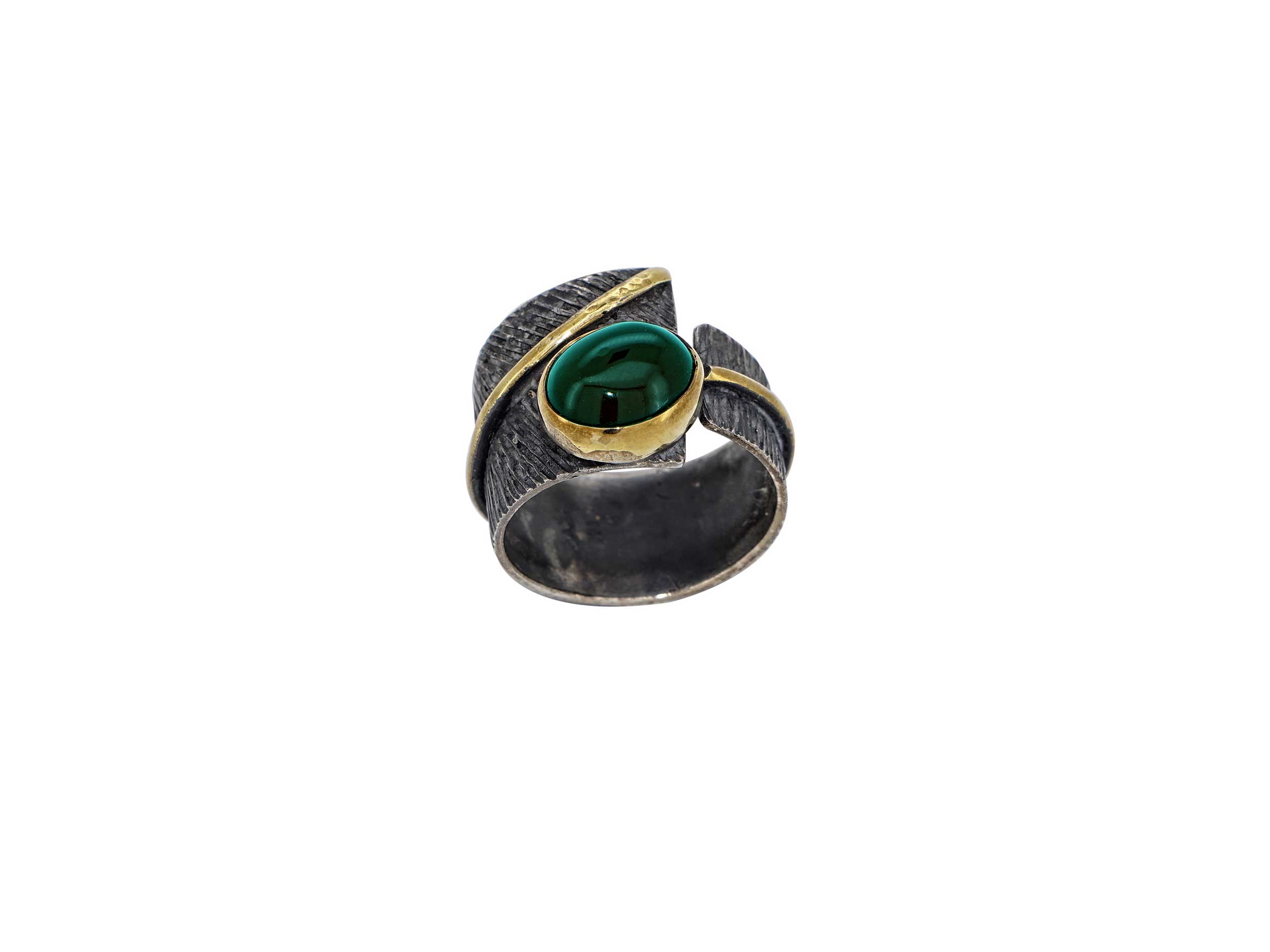 Χειροποίητο δαχτυλίδι με πέτρα πράσινη cabochon και υπέροχη ανάγλυφη σχεδίαση και λουστρέ και ζαγρέ φινίρισμα. Ένα εντυπωσιακό αντικέ δαχτυλίδι , από ασήμι 925, με μαύρο oxyde και επίχρυσες λεπτομέρειες.