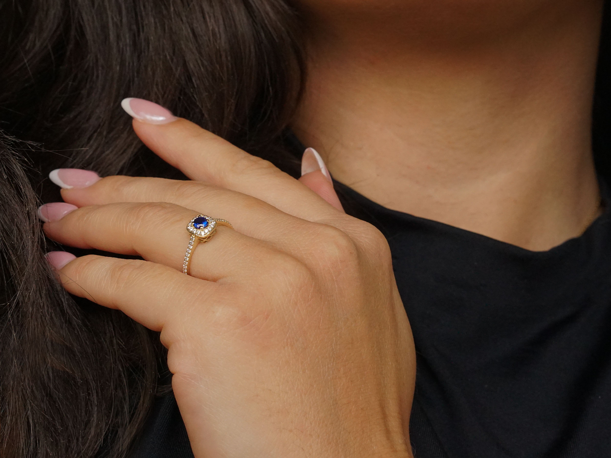 Δαχτυλίδι ροζέτα με μπλε πέτρα, σε χρυσό 9 Καρατίων. Ένα κομψό δαχτυλίδι, διακοσμημένο με μια εντυπωσιακή, μπλε cubic ζιργκόν πέτρα στο κέντρο και με λευκές cubic ζιργκόν πέτρες περιμετρικά και στη γάμπα. Το κατάλληλο κόσμημα για μια ξεχωριστή εμφάνιση!