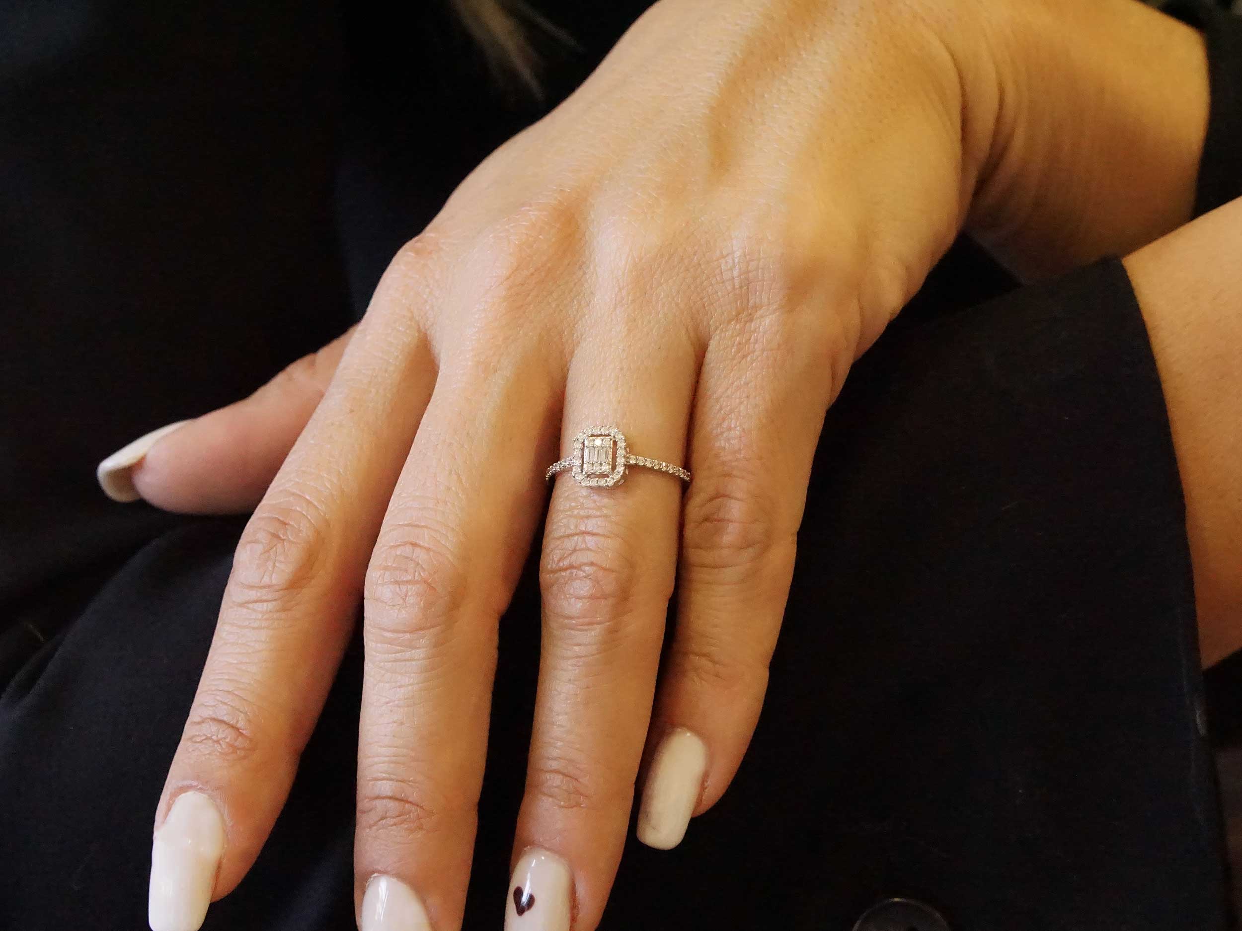 Δαχτυλίδι ροζέτα λευκόχρυση 8Κ, με λουστρέ φινίρισμα. Πρόκειται για ένα δαχτυλίδι από λαμπερές λευκές cubic ζιρκόν πέτρες που πλαισιώνουν την κεντρική πέτρα σε ορθογώνια κοπή baguette. Η γάμπα του στολισμένη με μικρές cubic ζιργκόν πέτρες ολοκληρώνει το σύνολο, προσδίδοντας εκλεπτυσμένη λάμψη χωρίς υπερβολή.