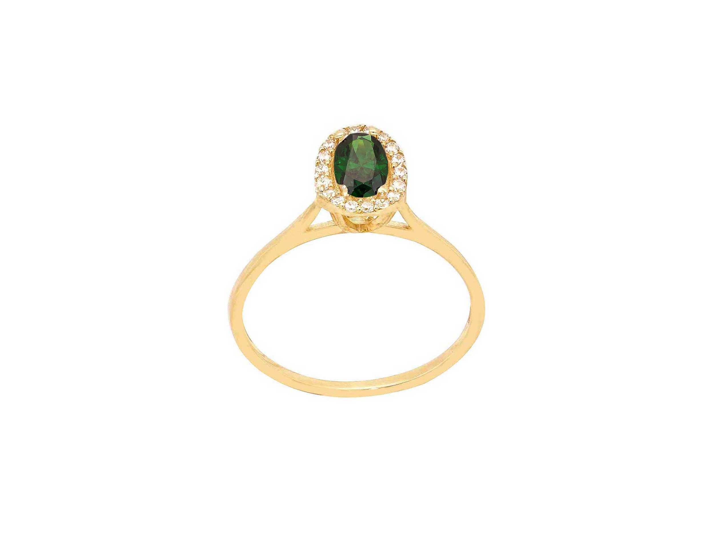 Δαχτυλίδι ροζέτα με πράσινη πέτρα, σε χρυσό 14 Καρατίων. Έχει λουστρέ φινίρισμα και είναι διακοσμημένο με μια πράσινη οβάλ πέτρα ζιργκόν περιτριγυρισμένη από λευκές cubic ζιργκόν πέτρες. Ένα δαχτυλίδι υψηλής αισθητικής, ιδανικό για να προσθέσει μια πινελιά χρώματος και πολυτέλειας σε κάθε εμφάνιση.