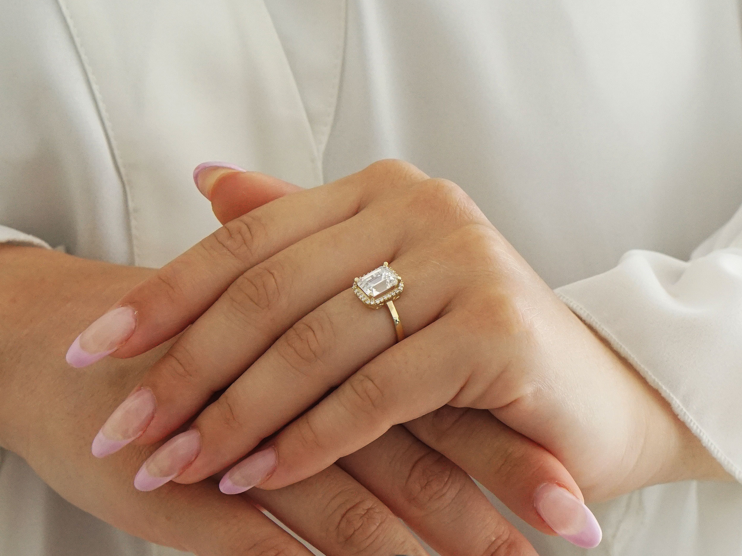 Δαχτυλίδι ροζέτα με ζιργκόν πέτρες, σε χρυσό 14 Καράτια. Έχει υπέροχο λουστρέ φινίρισμα και κοσμείται με λευκές cubic ζιργκόν πέτρες περιμετρικά και με μια εντυπωσιακή ζιργκόν πέτρα κοπής emerald στο κέντρο. Κομψό και διαχρονικό κόσμημα για κάθε περίσταση!