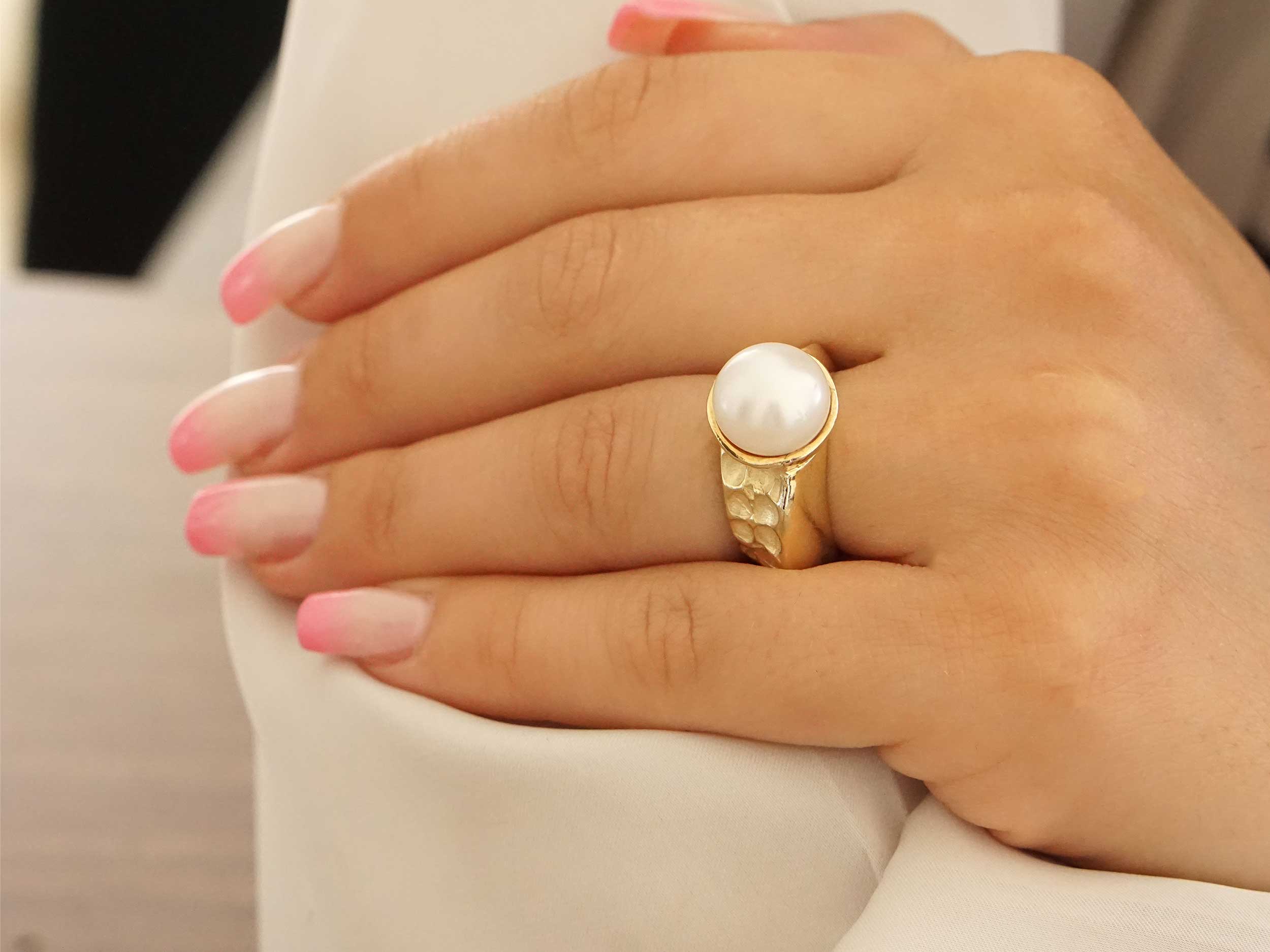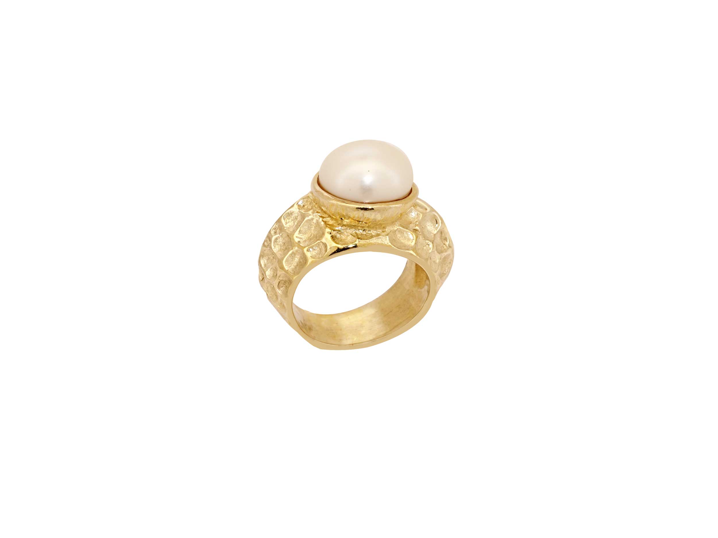 Χειροποίητο δαχτυλίδι σφυρήλατο, από επιχρυσωμένο ασήμι 925. Έχει ανάγλυφο σχέδιο και κοσμείται με ένα υπέροχο λευκό μαργαριτάρι. Μοναδικό δαχτυλίδι που θα ολοκληρώσει μια εντυπωσιακή εμφάνιση!