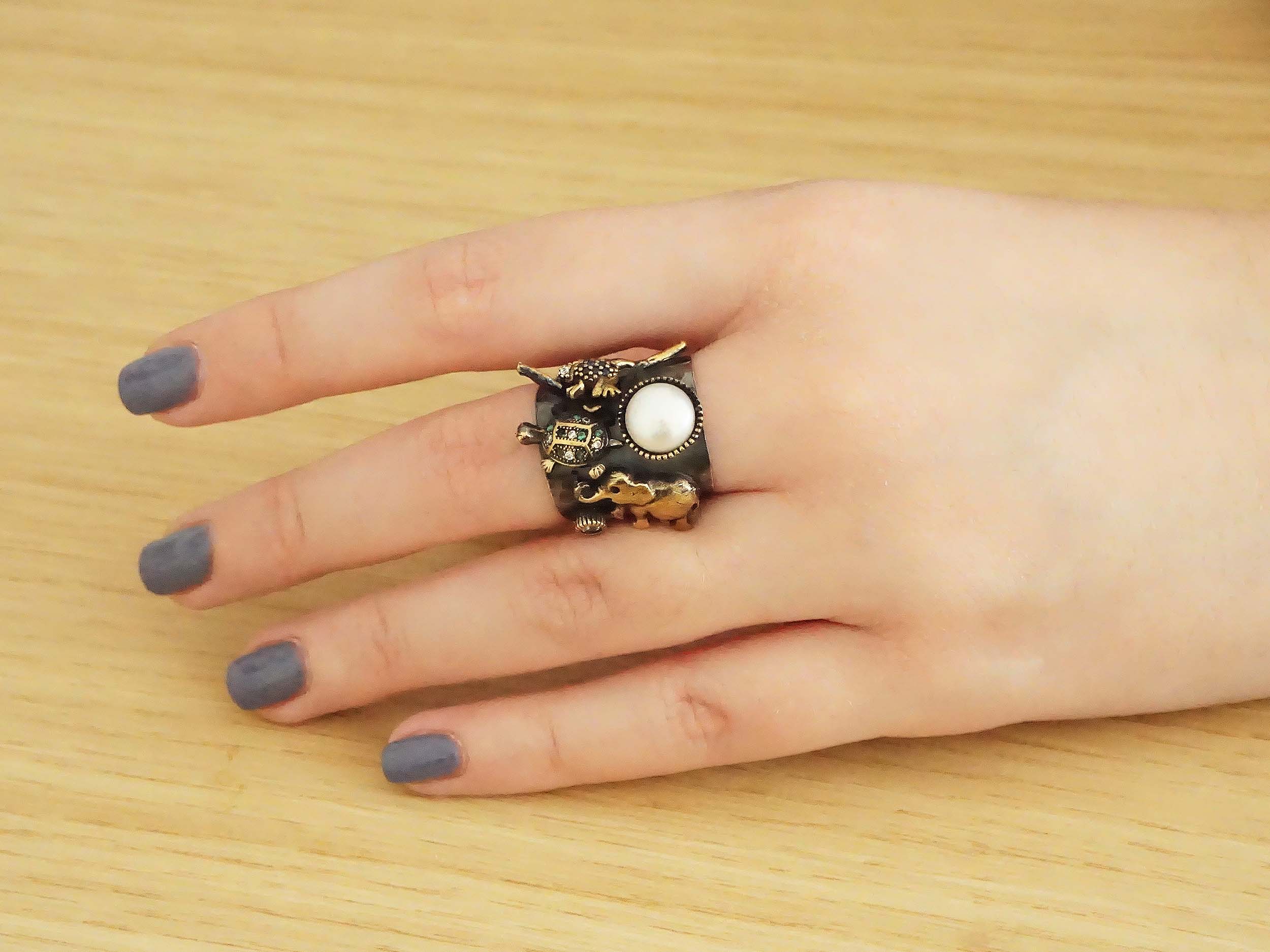 Ιδιαίτερο δαχτυλίδι για fashion icon κυρίες. Δαχτυλίδι με στοιχεία από ασήμι 925 με κεντρικό λευκό μαργαριτάρι. Επιβλητικό κόσμημα που ανοιγοκλείνει και έχει λουστρέ φινίρισμα και χρώμα μετάλλου κίτρινο και μαύρο oxyde. Τα στοιχεία κοσμούνται επίσης με λευκές, μπλε και πράσινες cubic ζιργκόν πέτρες. Είναι άμεσα διαθέσιμο. Θα σας αποσταλεί σε πολυτελή συσκευασία δώρου.