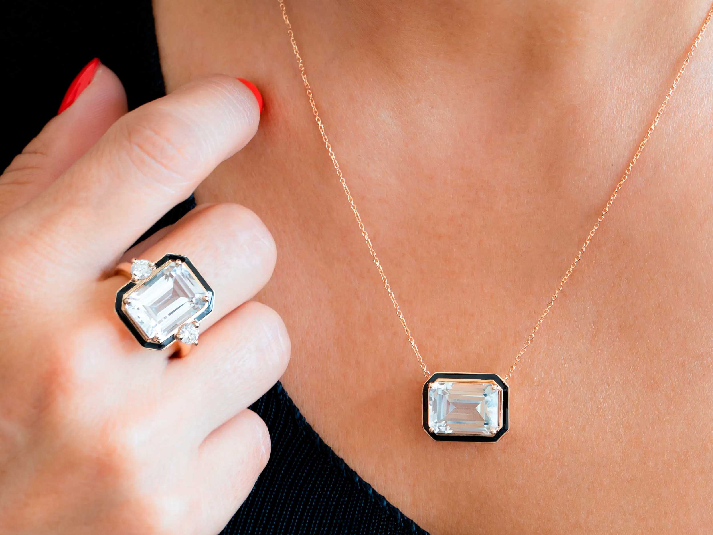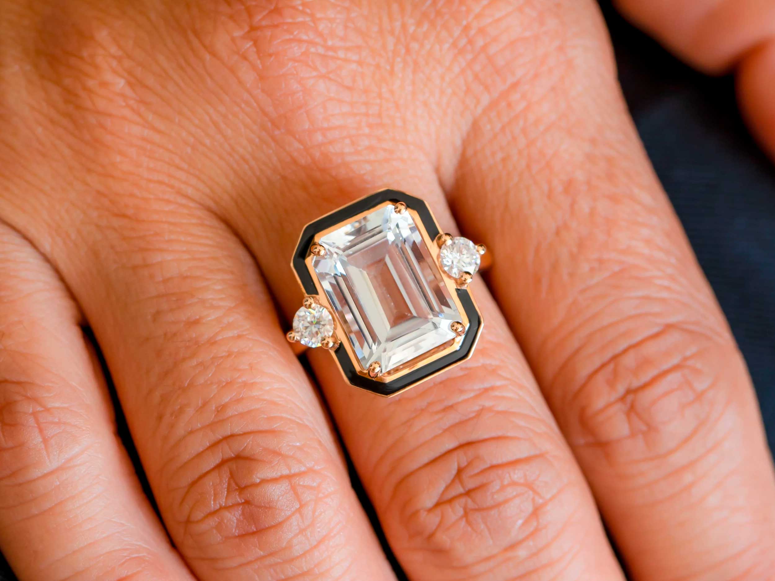 Δαχτυλίδι με τοπάζι σε ροζ χρυσό 18 Καρατίων. Κοσμείται με δύο πέτρες moissanite και μαύρο σμάλτο περιμετρικά. Ένα ιδιαίτερα εντυπωσιακό και λαμπερό δαχτυλίδι που θα λατρέψετε.
