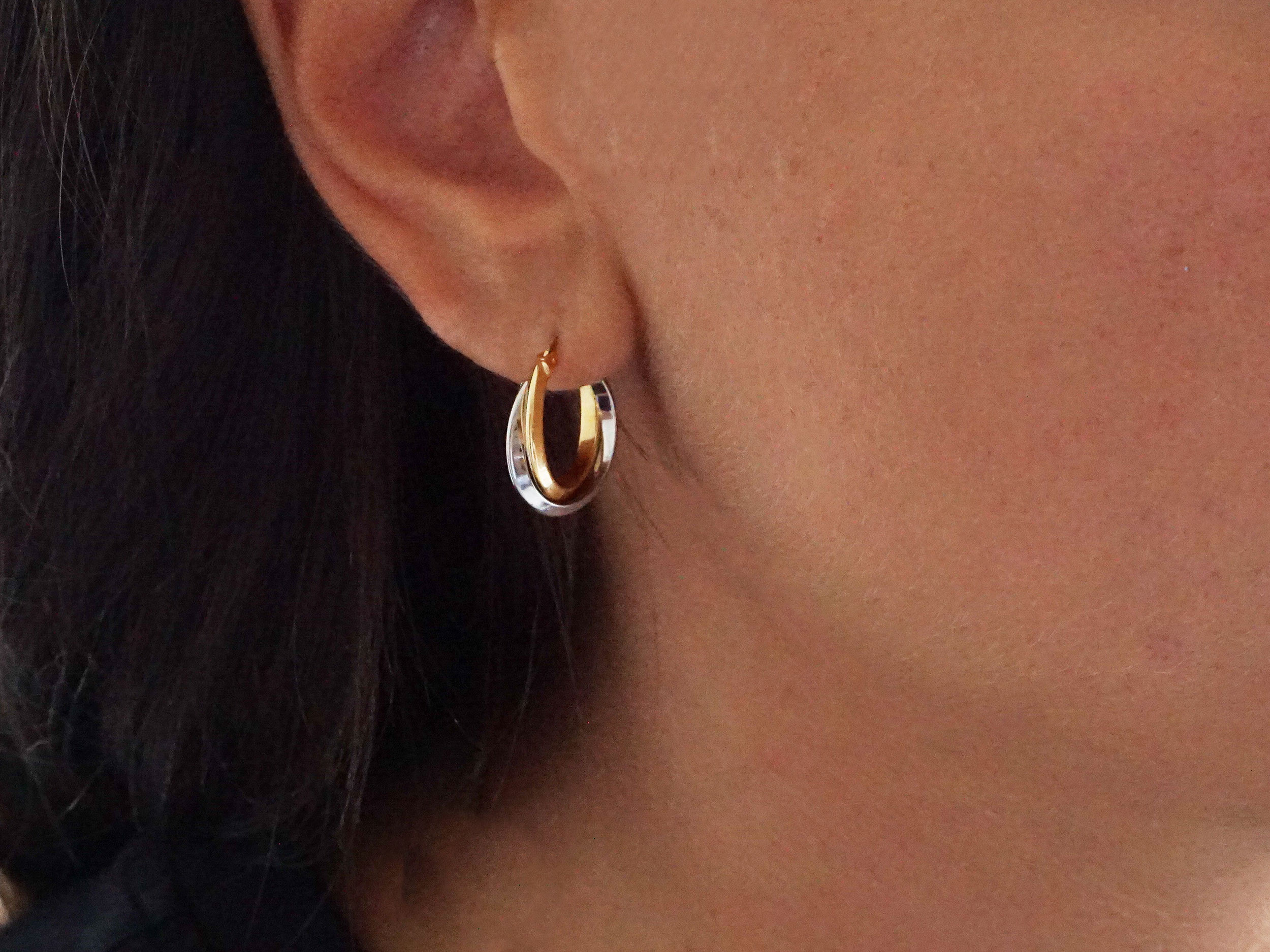 Δίχρωμα κρικάκια χρυσά 14 Καρατίων, με λουστρέ φινίρισμα. Κομψό ζευγάρι σκουλαρίκια κρίκοι διπλοί, σε κίτρινο χρυσό και λευκό χρυσό χρώμα. Ένα must-have κόσμημα για κάθε γυναίκα!