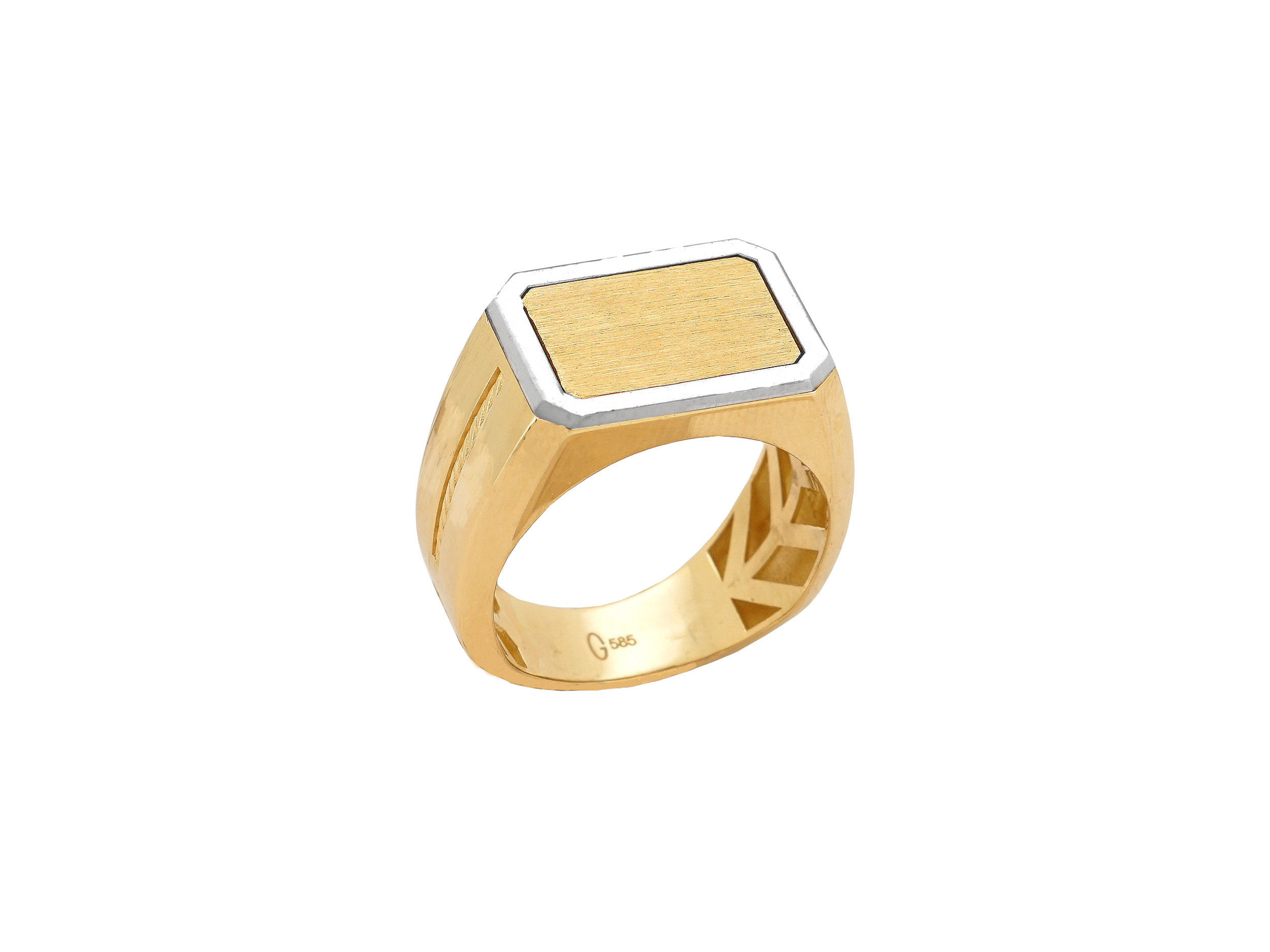 Δίχρωμο δαχτυλίδι ανδρικό χρυσό 14 Καρατίων, κατασκευασμένο από κίτρινο χρυσό με λευκόχρυσο περίγραμμα που προσφέρει μια κομψή αντίθεση. Τα πλαϊνά κοσμούνται με ανάγλυφες λεπτομέρειες.