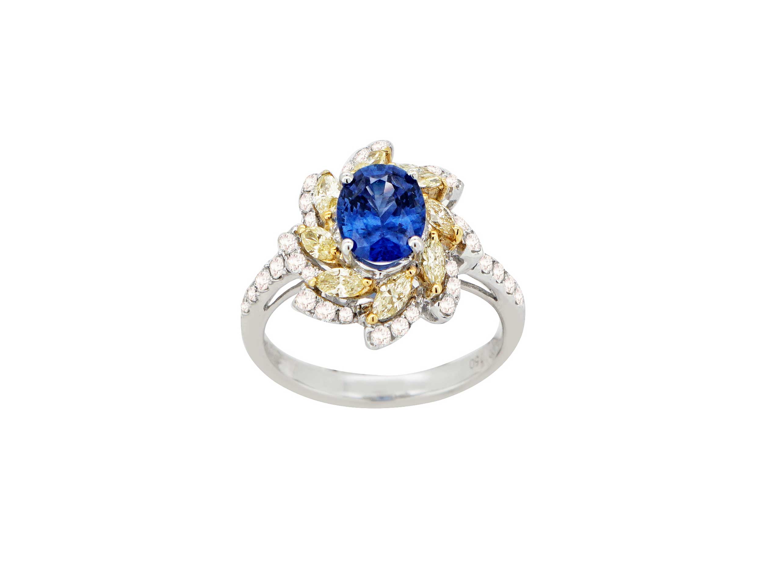 Εκθαμβωτικό δίχρωμο δαχτυλίδι με ζαφείρι και διαμάντια σε χρυσό 18 Καρατίων, με λουστρέ φινίρισμα. Κοσμείται στο κέντρο με ένα λαμπερό ζαφείρι 1,61 ct, περιμετρικά με 8 λαμπερά διαμάντια marquise cut 0,50 ct σε fancy yellow χρώμα και με 32 διαμάντια κοπής rount brilliant 0,44 ct. Ένα κόσμημα ιδανικό για επίσημες περιστάσεις ή ως δώρο μοναδικής αξίας.
