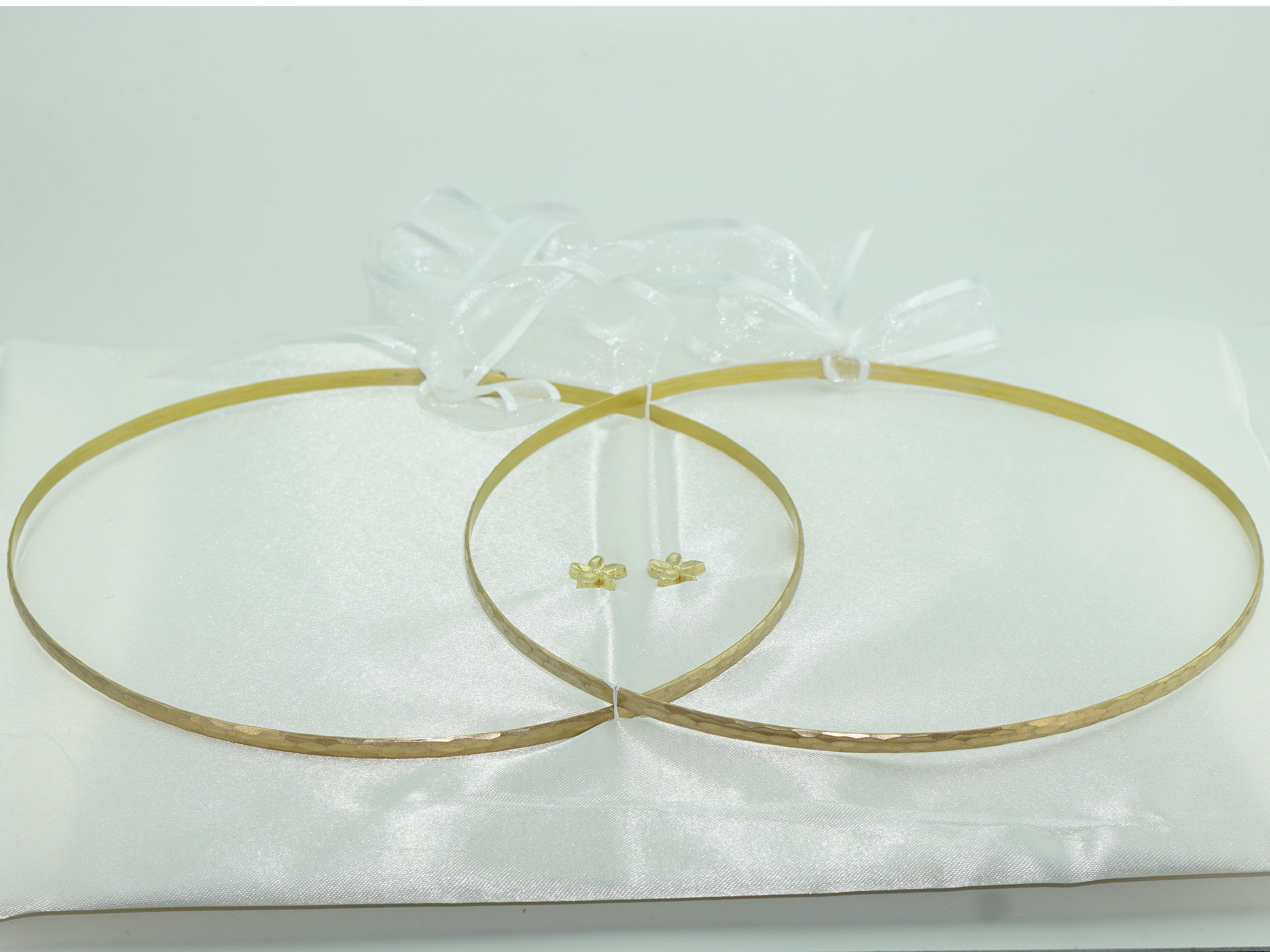 Χειροποίητα επάργυρα στέφανα γάμου με ματ φινίρισμα. Minimal χειροποίητα στέφανα σε κίτρινο χρώμα με σφυρήλατη βέργα ύψους 4 χιλιοστών. Κοσμούνται με μια λευκή κορδέλα και αποστέλλονται σε στεφανοθήκη πολυτελείας μαζί με μπουτονιέρες για το πέτο του γαμπρού και του κουμπάρου.