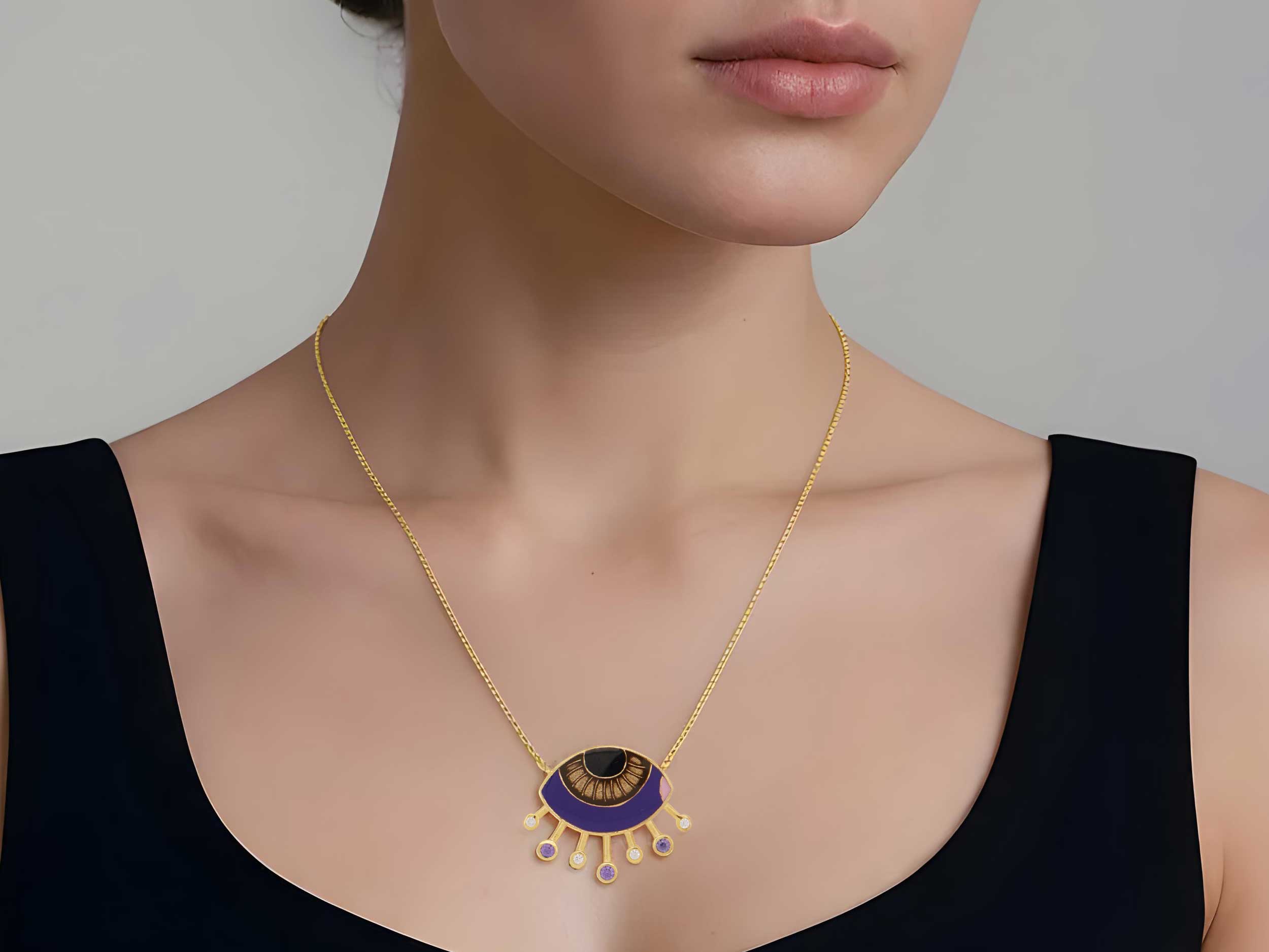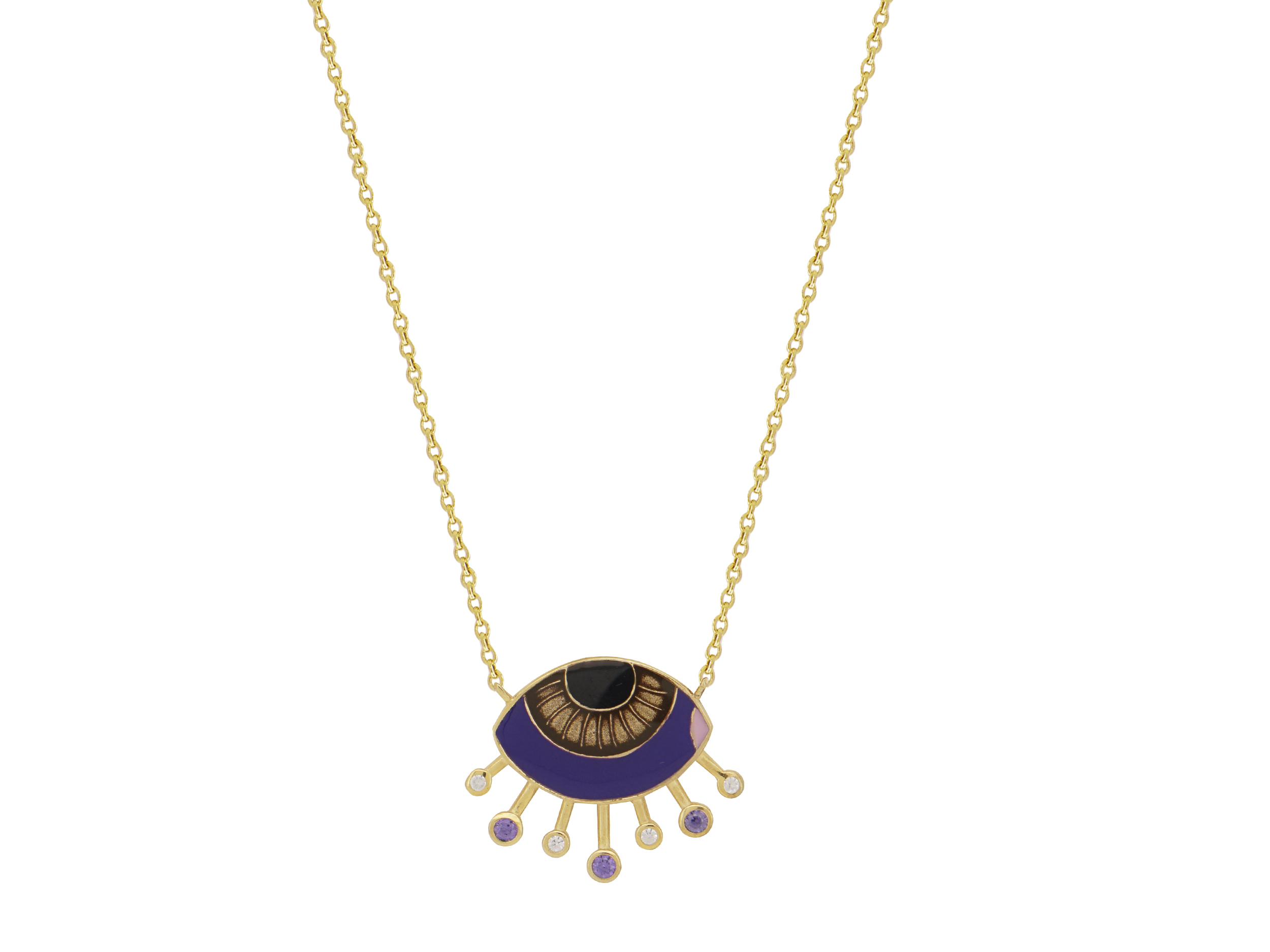 Κολιέ με μοβ μάτι, σε επιχρυσωμένο ασήμι 925, διακοσμημένο με σμάλτο σε μαύρο, καφέ, ροζ και μοβ χρώμα. Στο κάτω μέρος του ματιού είναι τοποθετημένες λευκές και μοβ λαμπερές cubic ζιργκόν πέτρες. Ιδανικό κόσμημα για να αναδείξετε τα λουκ σας!