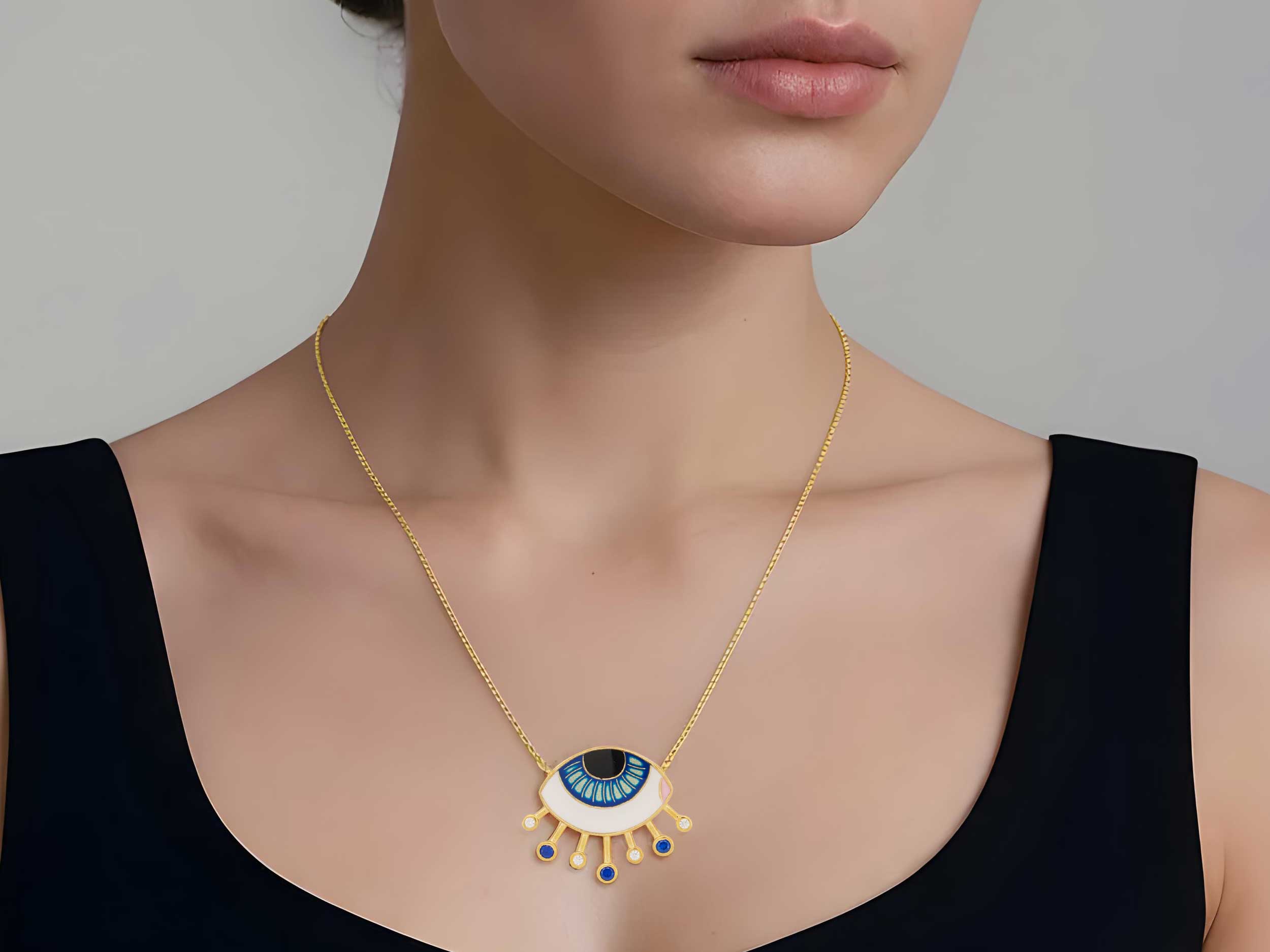 Κολιέ με μπλε μάτι, σε επιχρυσωμένο ασήμι 925, διακοσμημένο με σμάλτο σε μαύρο, μπλε, ροζ και λευκό χρώμα. Στο κάτω μέρος του ματιού είναι τοποθετημένες λευκές και μπλε λαμπερές cubic ζιργκόν πέτρες. Ιδανικό κόσμημα για να αναδείξετε τα λουκ σας!