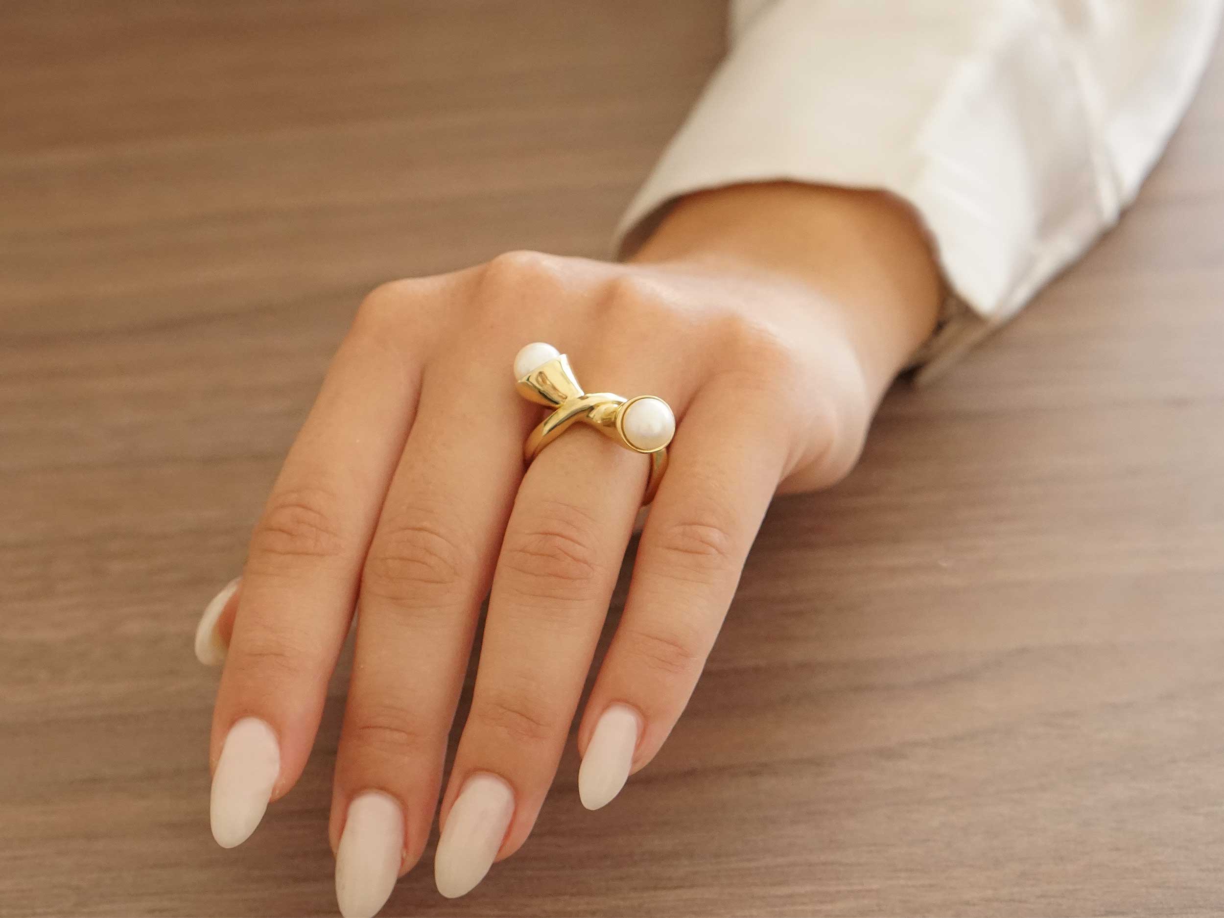 Επίχρυσο δαχτυλίδι με μαργαριτάρια, σε ασήμι 925. Κοσμείται με δύο υπέροχα λευκά μαργαριτάρια και έχει ιδιαίτερη, κυματιστή γάμπα με λουστρέ φινίρισμα. Ένα εντυπωσιακό χειροποίητο δαχτυλίδι με επιχρύσωμα 18 Καρατίων που θα σας κάνει να ξεχωρίσετε!