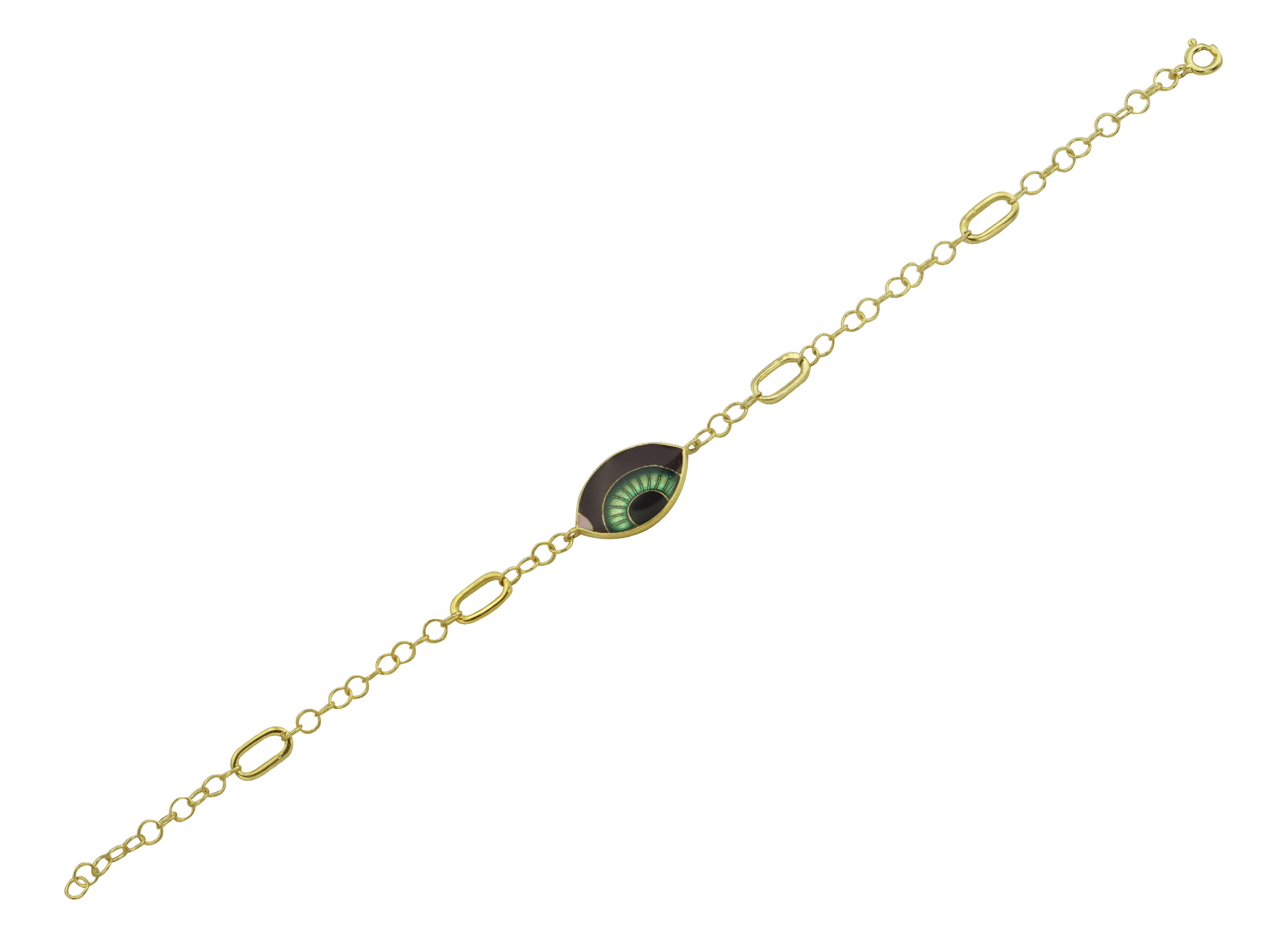 Επίχρυσο βραχιόλι με μάτι, από ασήμι 925. Το μέταλλο είναι κίτρινου χρώματος με λουστρέ φινίρισμα. Κεντρικά διαθέτει ένα μάτι με διακόσμηση από σμάλτο. Ιδανικό κόσμημα για καθημερινές εμφανίσεις.