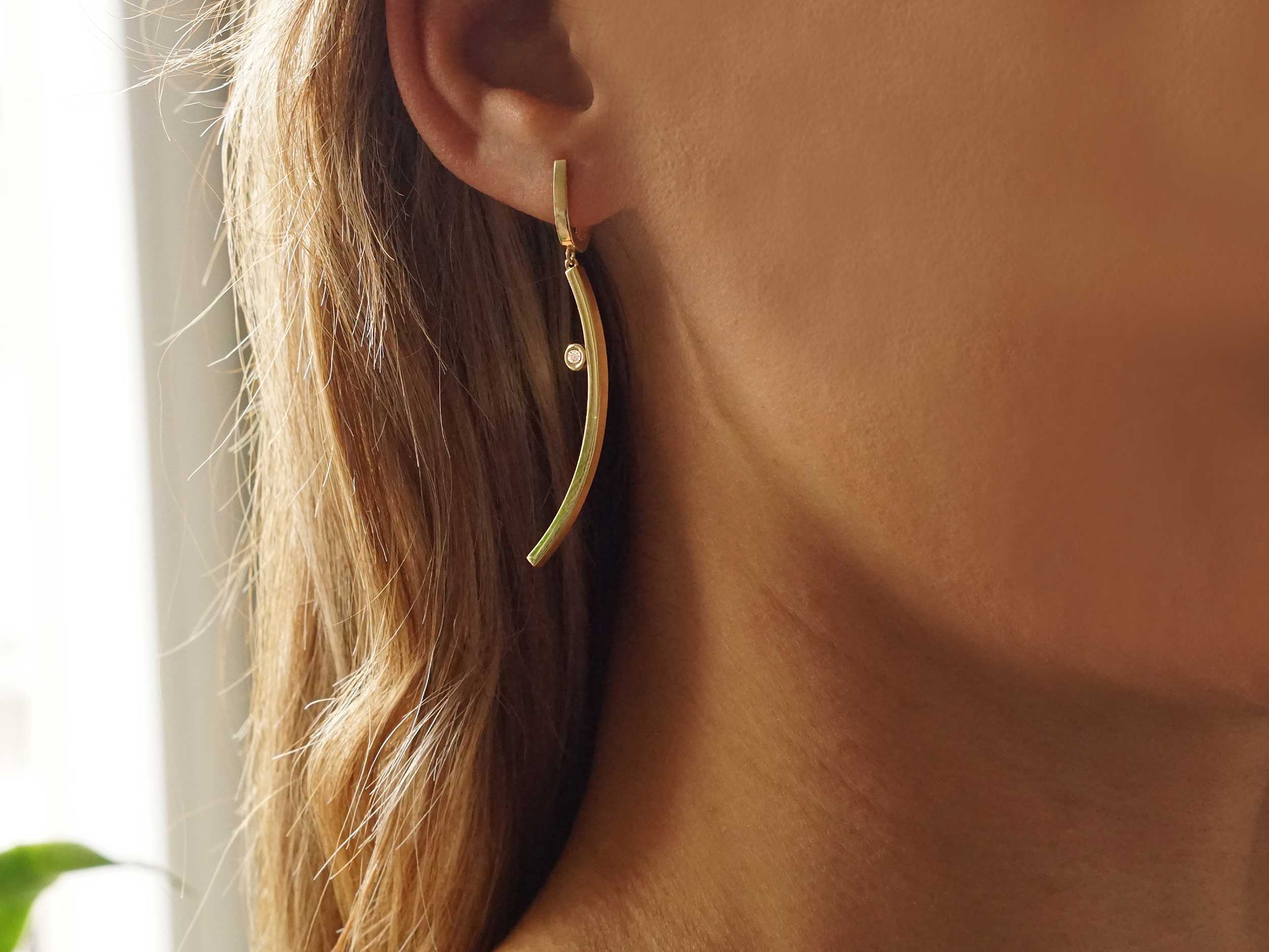 Υπέροχα γυναικεία κρεμαστά σκουλαρίκια σε χρυσό 14Κ, με λουστρέ φινίρισμα. Το συνολικό τους μήκος είναι 5,50 cm και το πλάτος τους 3mm. Ένα εντυπωσιακό minimal ζευγάρι σκουλαρίκια με λευκές cubic ζιργκόν πέτρες που θα λατρέψετε και θα αναδείξουν την εμφάνισή σας. Το καθαρό, γεωμετρικό σχέδιο τους τα καθιστά ιδανικά για γυναίκες που αγαπούν τη μοντέρνα κομψότητα. Αποστέλλονται σε συσκευασία δώρου.