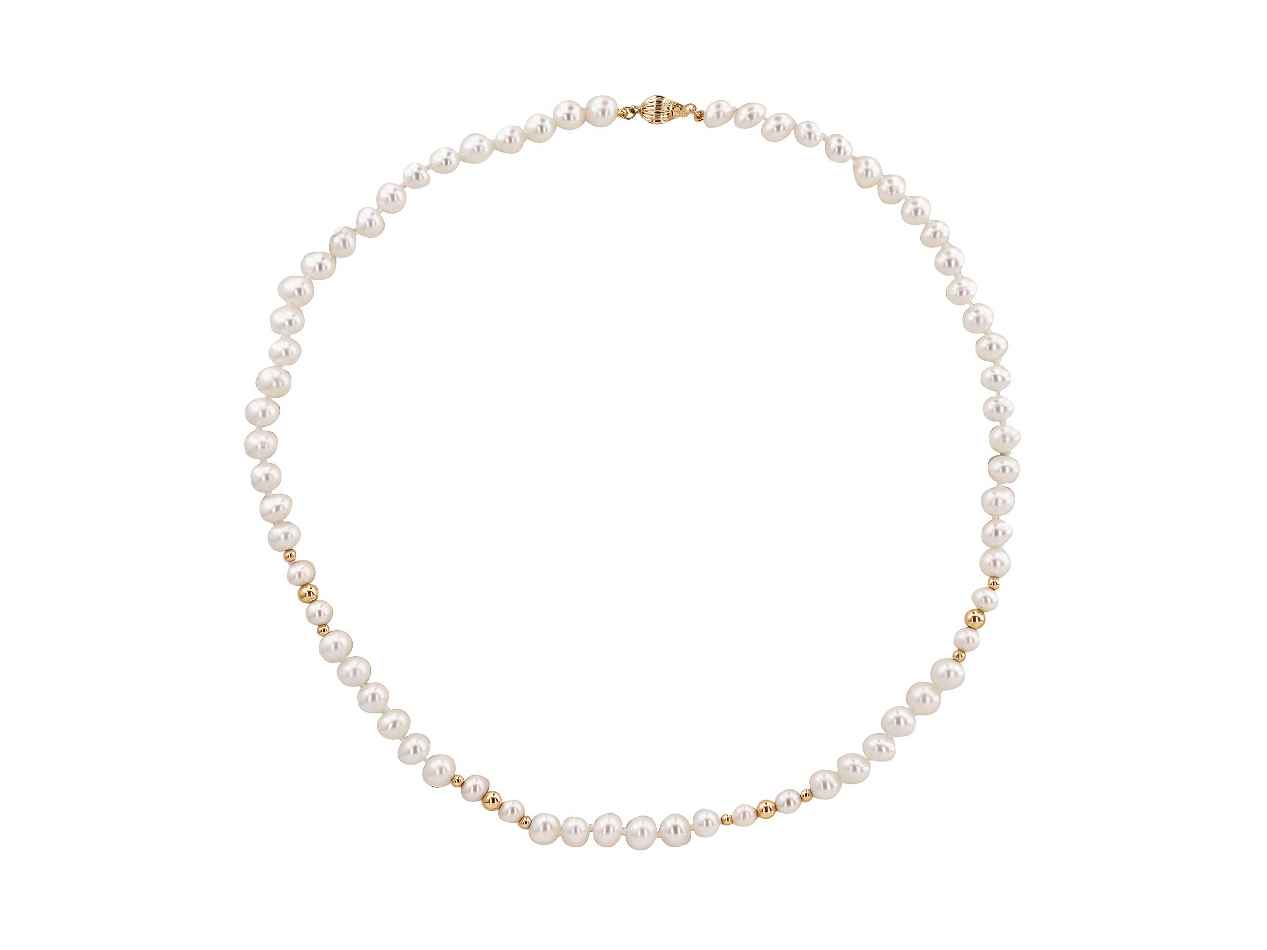 Κολιέ fresh water pearls 6-6,5 mm, με χρυσό κούμπωμα 14 Καρατίων. Κοσμείται ενδιάμεσα με 12 λαμπερές, χρυσές μπίλιες 14 Καρατίων διαμέτρου 2,5-4 mm. Επιλέξτε το για μια επίσημη έξοδο ή ως ένα πολύτιμο δώρο με διαχρονική αξία.
