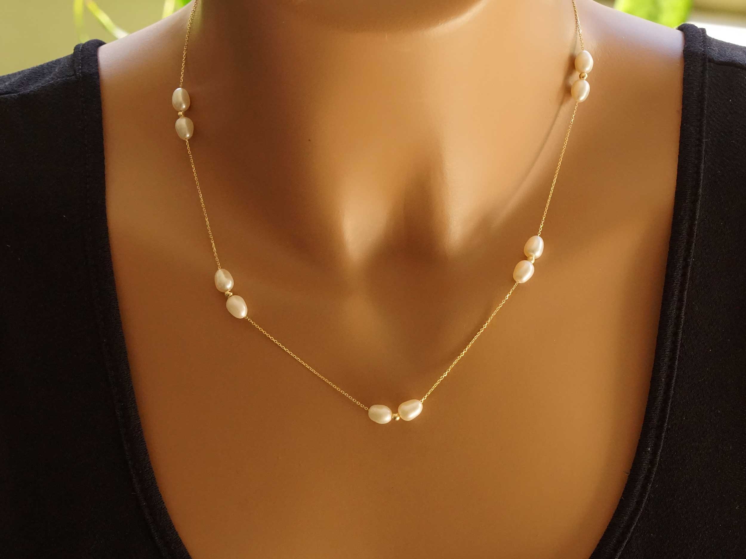 Κολιέ με φυσικά μαργαριτάρια, σε χρυσό 14 Καρατίων. Ένα κόσμημα με διαχρονική κομψότητα, διακοσμημένο με 10 fresh water pearls διαστάσεων 5 x 7 mm και πέντε χρυσές μπίλιες 14Κ. Είναι το ιδανικό κόσμημα για layering, ενώ μπορεί να φορεθεί υπέροχα και μόνο του, αναδεικνύοντας διακριτικά το σύνολό σας.