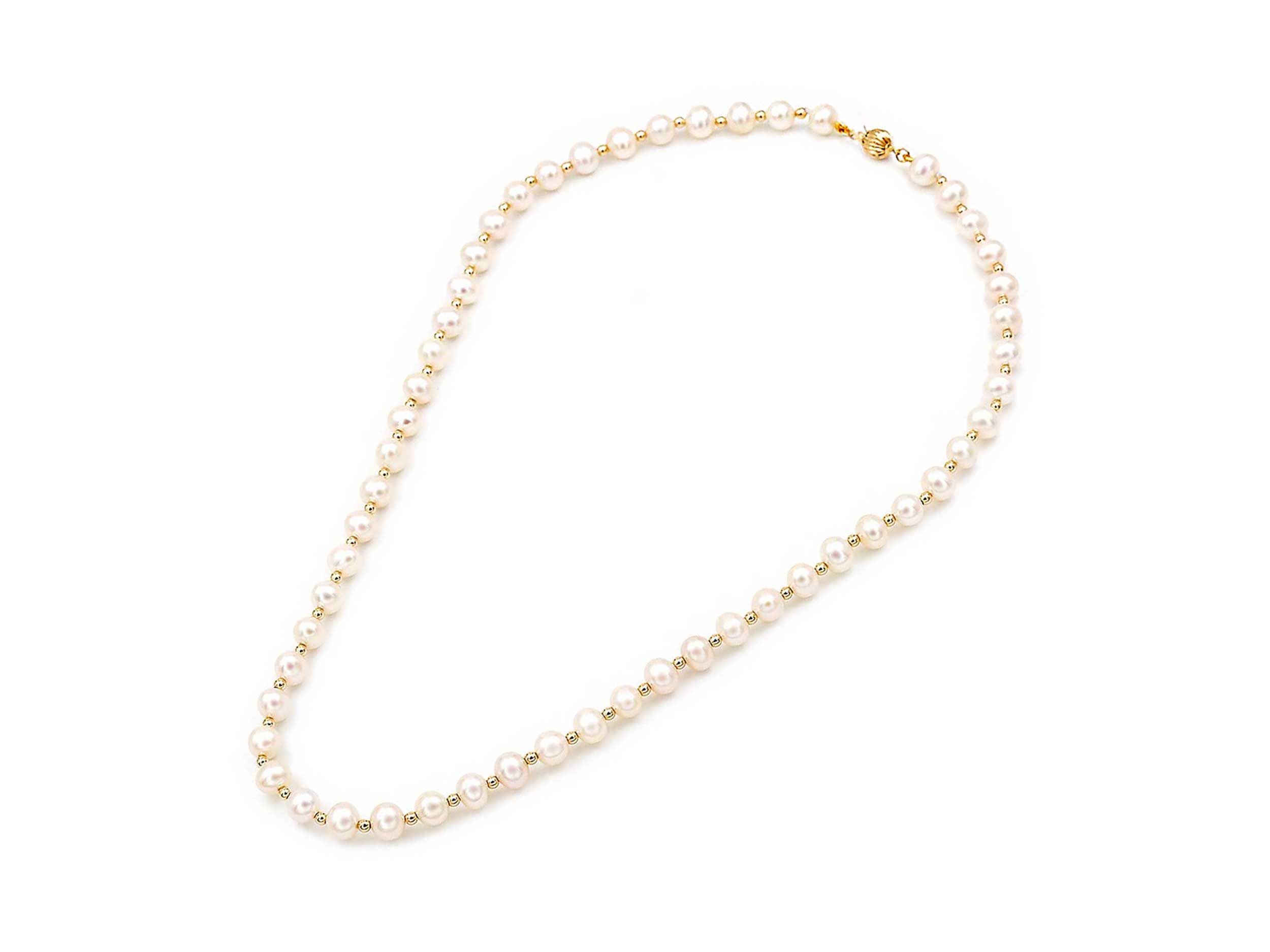Κολιέ από φυσικά μαργαριτάρια, με χρυσό κούμπωμα 14 Καρατίων. Κοσμείται ενδιάμεσα με 52 λαμπερές, χρυσές μπίλιες 14 Καρατίων διαμέτρου 2,5 mm. Επιλέξτε το για μια επίσημη έξοδο ή ως ένα πολύτιμο δώρο για το αγαπημένο σας πρόσωπο.