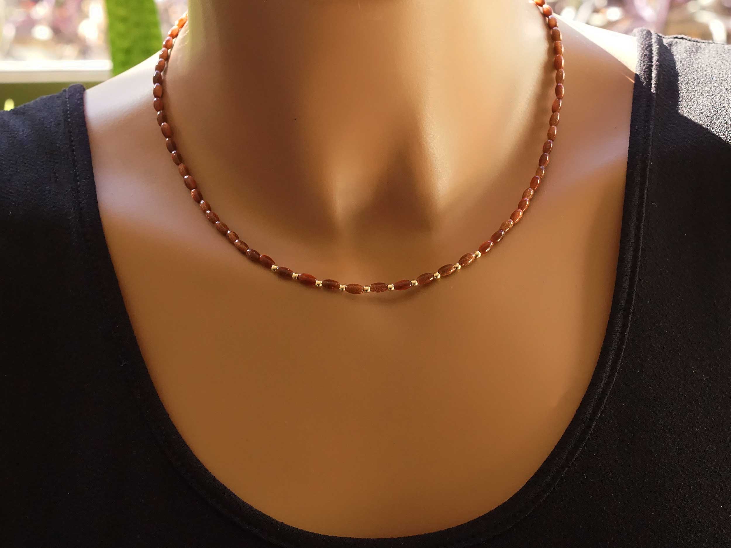 Κολιέ με καφέ πέτρες 3 x 5 mm και χρυσό κούμπωμα 14Κ. Ανακαλύψτε τη λάμψη του καφέ χρυσόλιθου που συνδυάζεται αρμονικά με 20 λαμπερές χρυσές μπίλιες 14 Καρατίων. Φορέστε το μόνο του ή σε layering με άλλα κολιέ.
