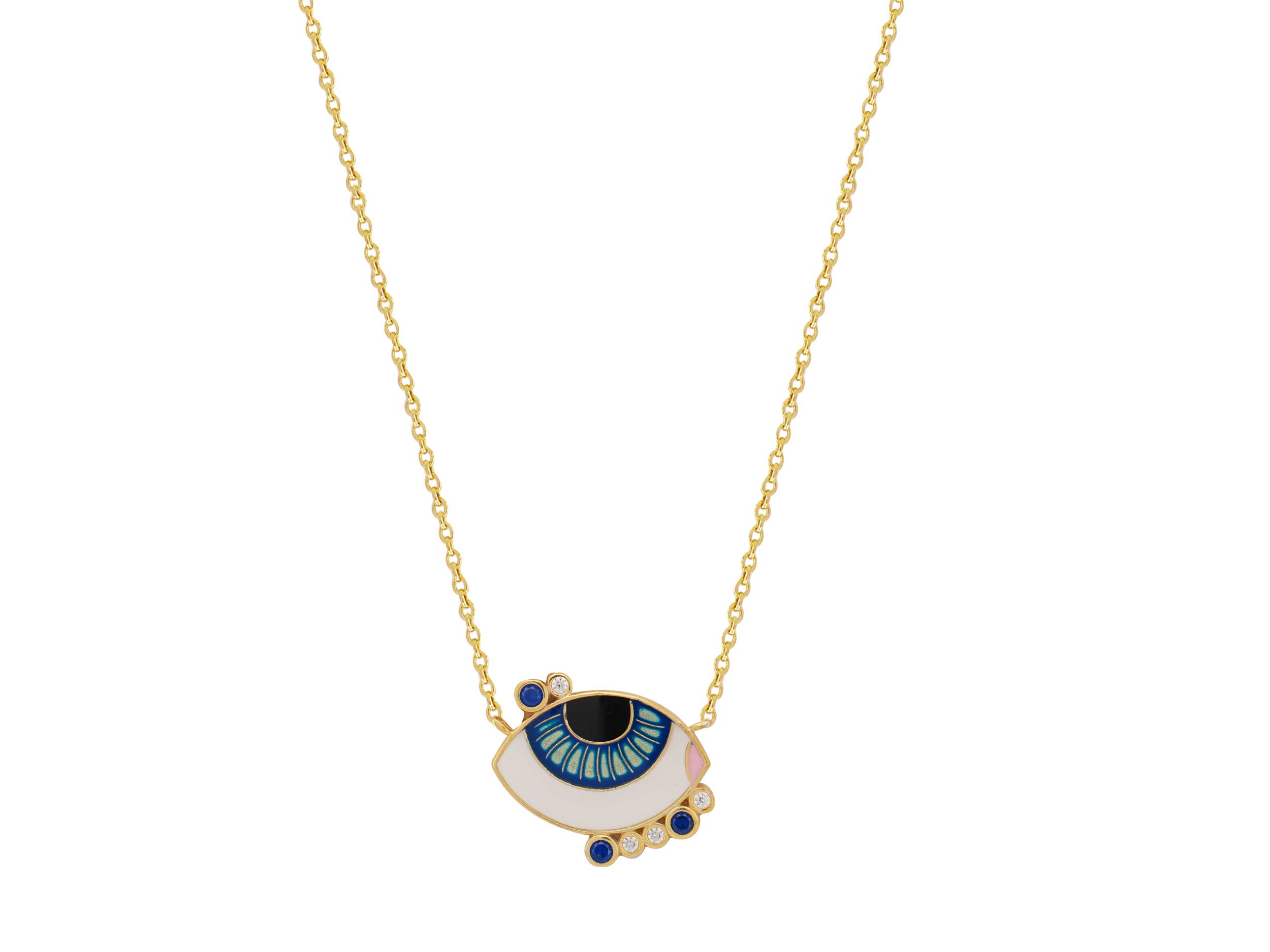 Κολιέ με μπλε μάτι, από επιχρυσωμένο ασήμι 925. Το μάτι είναι κατασκευασμένο από σμάλτο σε μαύρο, μπλε, λευκό και ροζ χρώμα. Περιμετρικά είναι τοποθετημένες λευκές και μπλε cubic ζιργκόν πέτρες που δίνουν επιπλέον λάμψη.