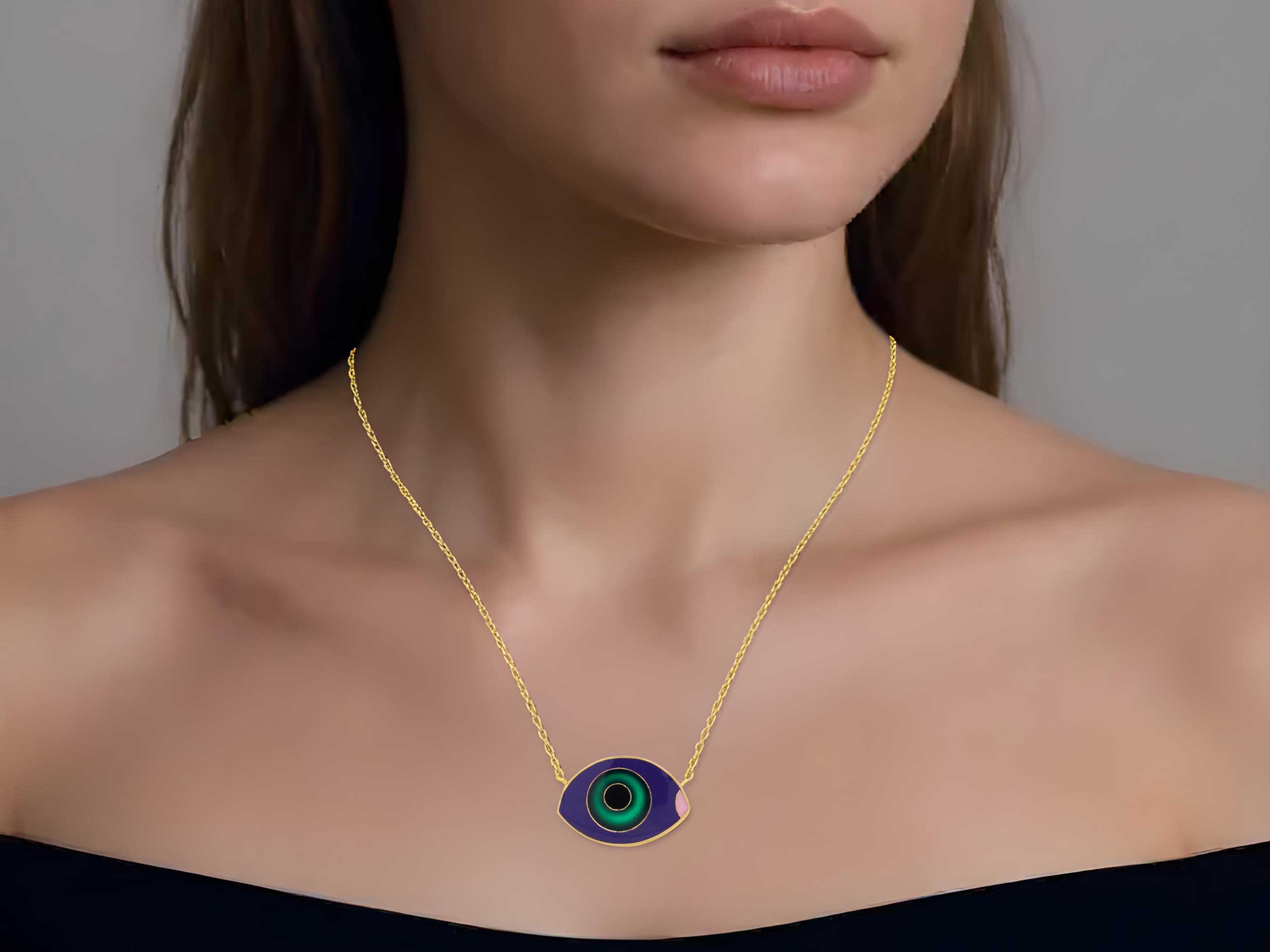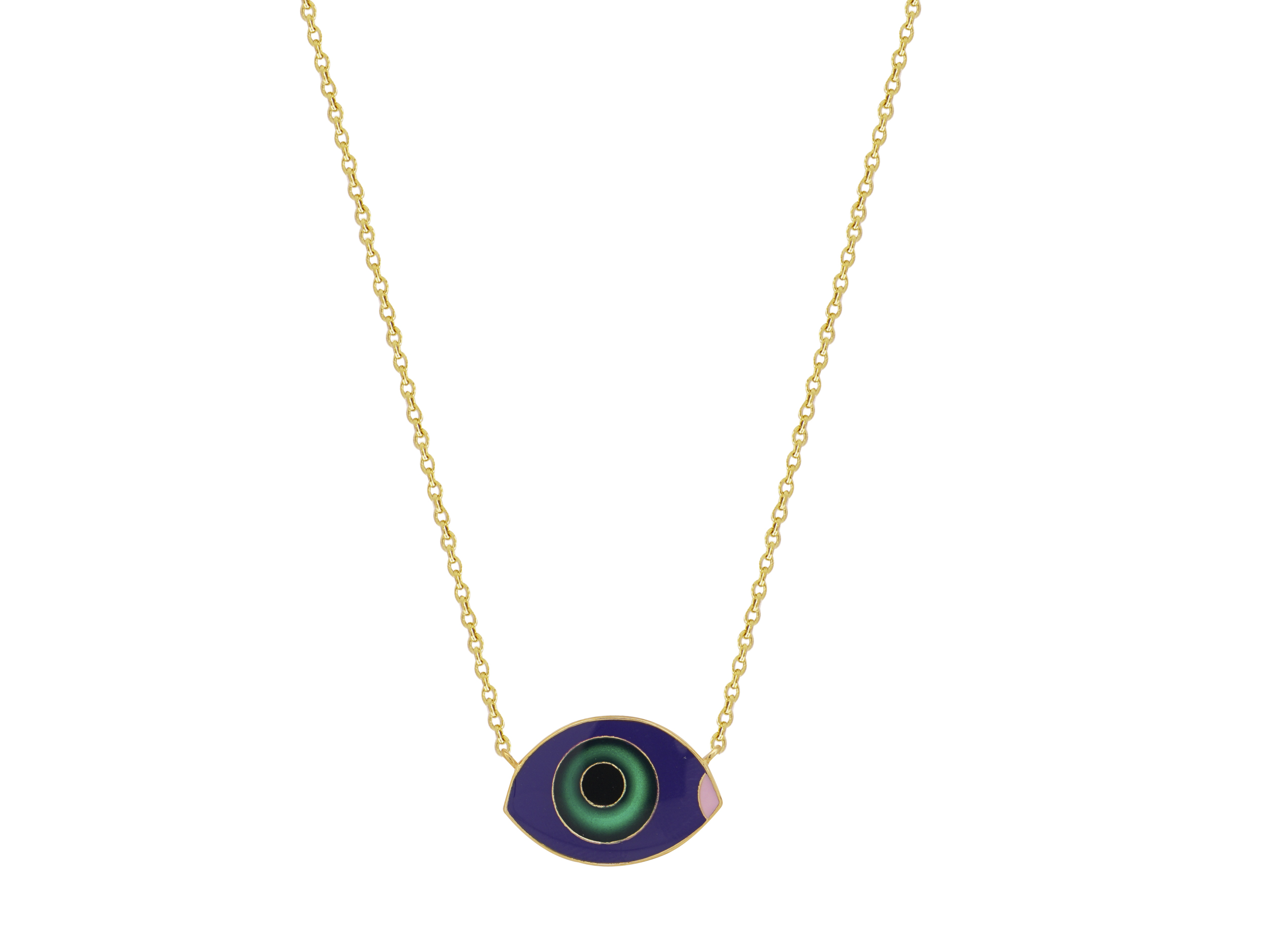 Κολιέ με πράσινο μάτι, επιχρυσωμένο ασήμι 925, διακοσμημένο με σμάλτο σε μαύρο, μωβ, ροζ και πράσινο χρώμα. Το συνολικό μήκος της αλυσίδας είναι 41,00 cm. Διακριτικό κόσμημα που μπορεί να φορεθεί μόνο του ή σε συνδυασμό με άλλα κολιέ για ένα εντυπωσιακό layer.