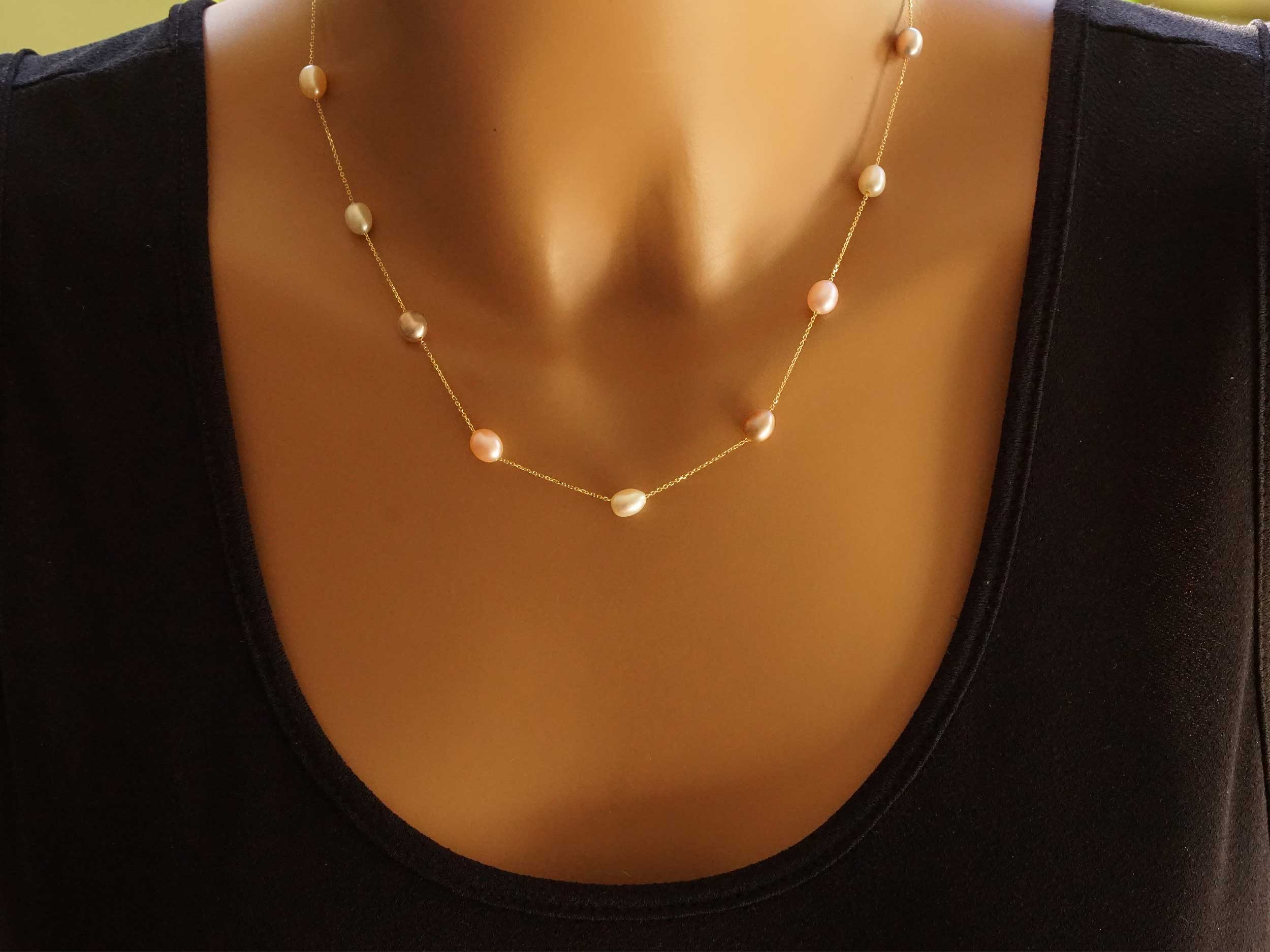 Κολιέ με πολύχρωμα μαργαριτάρια, σε χρυσό 14 Καρατίων. Ένα ιδιαίτερο κόσμημα, με 12 fresh water pearls διαστάσεων 5,5 x 7 mm σε υπέροχες αποχρώσεις του λευκού, ροζ και μωβ. Ιδανική επιλογή για να προσθέσετε μια πινελιά χρώματος και ρομαντισμού στην καθημερινότητά σας.