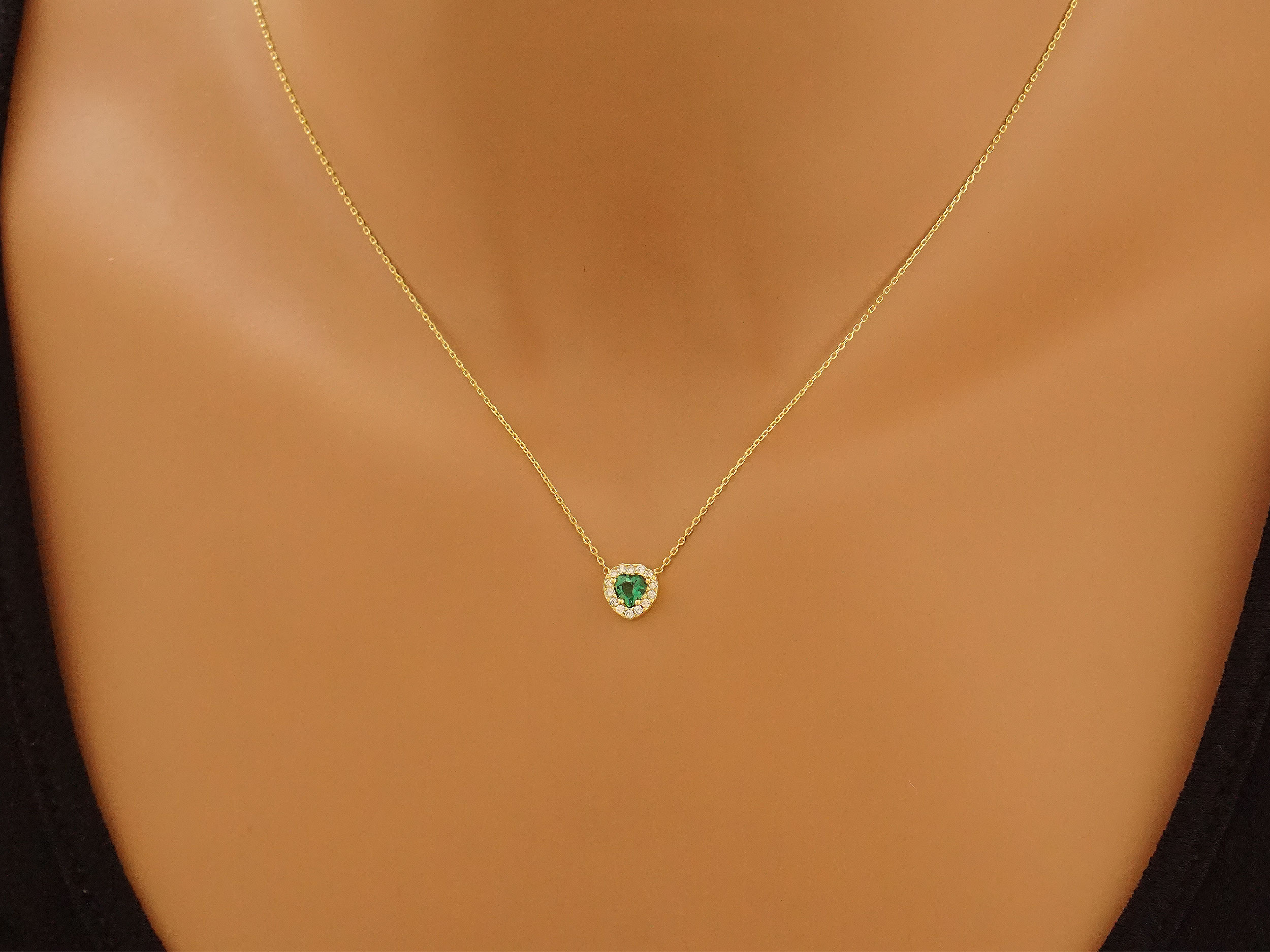 Κολιέ με πράσινη καρδιά, σε χρυσό 9 Καρατίων. Κοσμείται με μια λαμπερή πράσινη ζιργκόν πέτρα στο κέντρο και με λευκές cubic ζιργκόν πέτρες περιμετρικά. Ιδανικό δώρο για την αγαπημένη σας!
