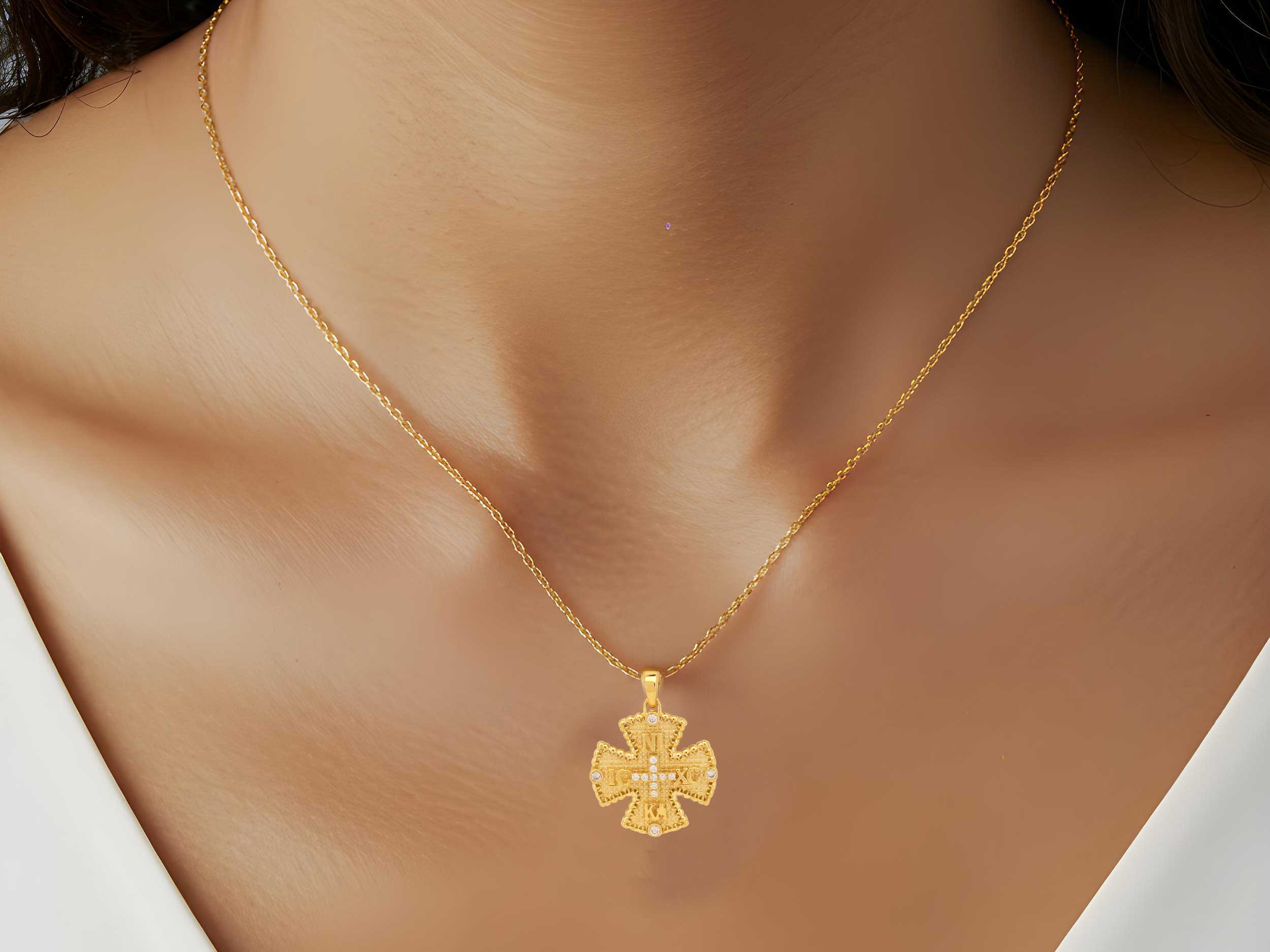 Κωνσταντινάτο με ζιργκόν πέτρες, διπλής όψης, σε χρυσό 14 Καράτια. Το φινίρισμά του είναι λουστρέ και ζαγρέ. Κοσμείται στη μία πλευρά με την επιγραφή ΙΧΝΚ και στην άλλη με σταυρό και με λευκές cubic ζιργκόν πέτρες και στις δύο όψεις του. Το συνολικό μήκος του με τον κρίκο είναι 2,30 cm. Μπορεί να συνδυαστεί με παραμάνα ή με μία χρυσή αλυσίδα.