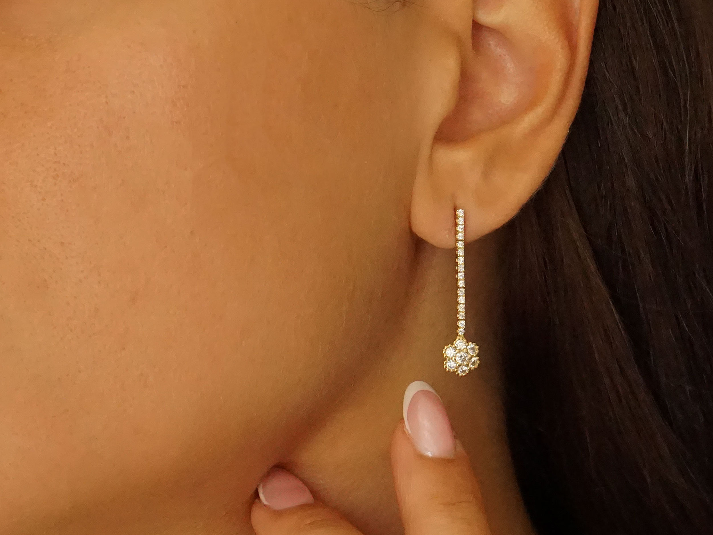 Υπέροχα κρεμαστά γυναικεία σκουλαρίκια σε χρυσό 14Κ.  Κοσμούνται από λαμπερές cubic ζιργκόν πέτρες και διαθέτουν λουστρέ φινίρισμα. Στο τελείωμά τους έχουν από ένα λουλουδάκι με λευκές πέτρες. Είναι ιδανικά για τις γυναίκες που θέλουν να ξεχωρίζουν σε κάθε τους εμφάνιση προσδίδοντας μια αίσθηση πολυτέλειας και διαχρονικής ομορφιάς.
