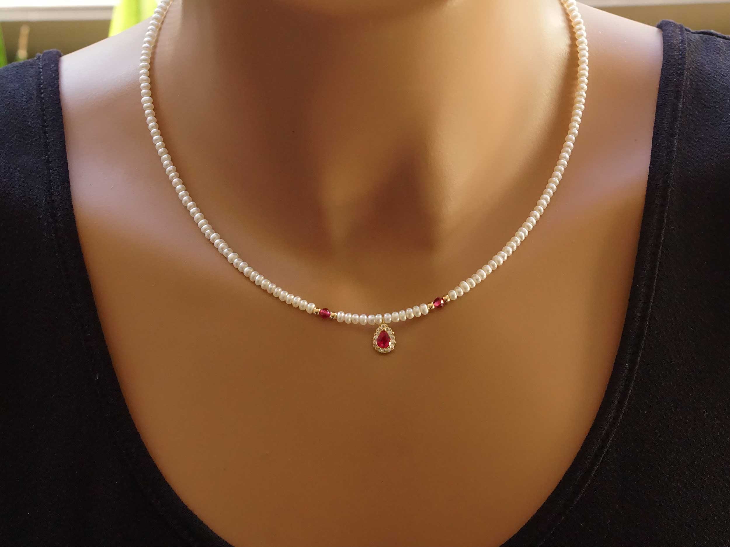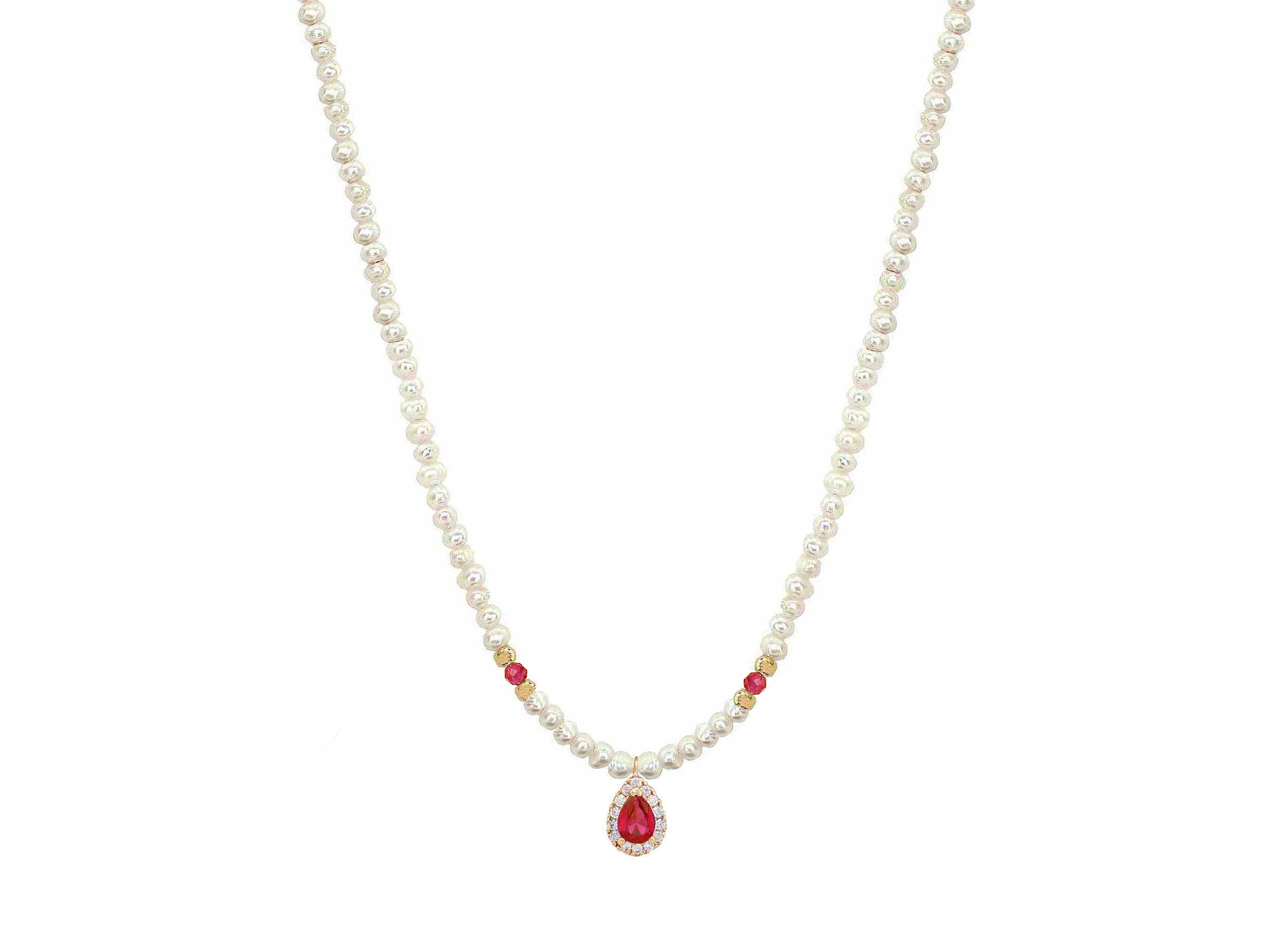 Κολιέ κρεμαστό με μαργαριτάρια σε χρυσό 14Κ. Ένας μοναδικός συνδυασμός από fresh water pearls με διάμετρο 2,50 – 3,00 mm, 4 χρυσές μπίλιες και λαμπερές cubic ζιργκόν πέτρες σε λευκό και κόκκινο χρώμα. Επιλέξτε το για μια ειδική περίσταση ή για μια βραδινή σας έξοδο και μαγνητίστε τα βλέμματα.