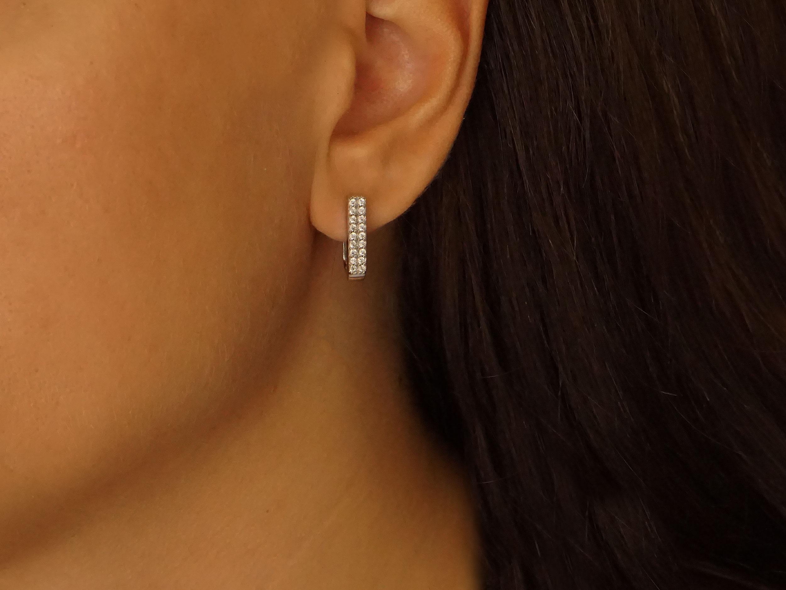 Λευκόχρυσα σκουλαρίκια με κλιπ 14 Καρατίων. Το φινίρισμά τους είναι λουστρέ και το πλάτος τους 4 mm. Κοσμούνται με λαμπερές cubic ζιργκόν πέτρες σε λευκό χρώμα. Ένα κομψό και διαχρονικό ζευγάρι σκουλαρίκια με άψογη σχεδίαση, για κάθε σας εμφάνιση!