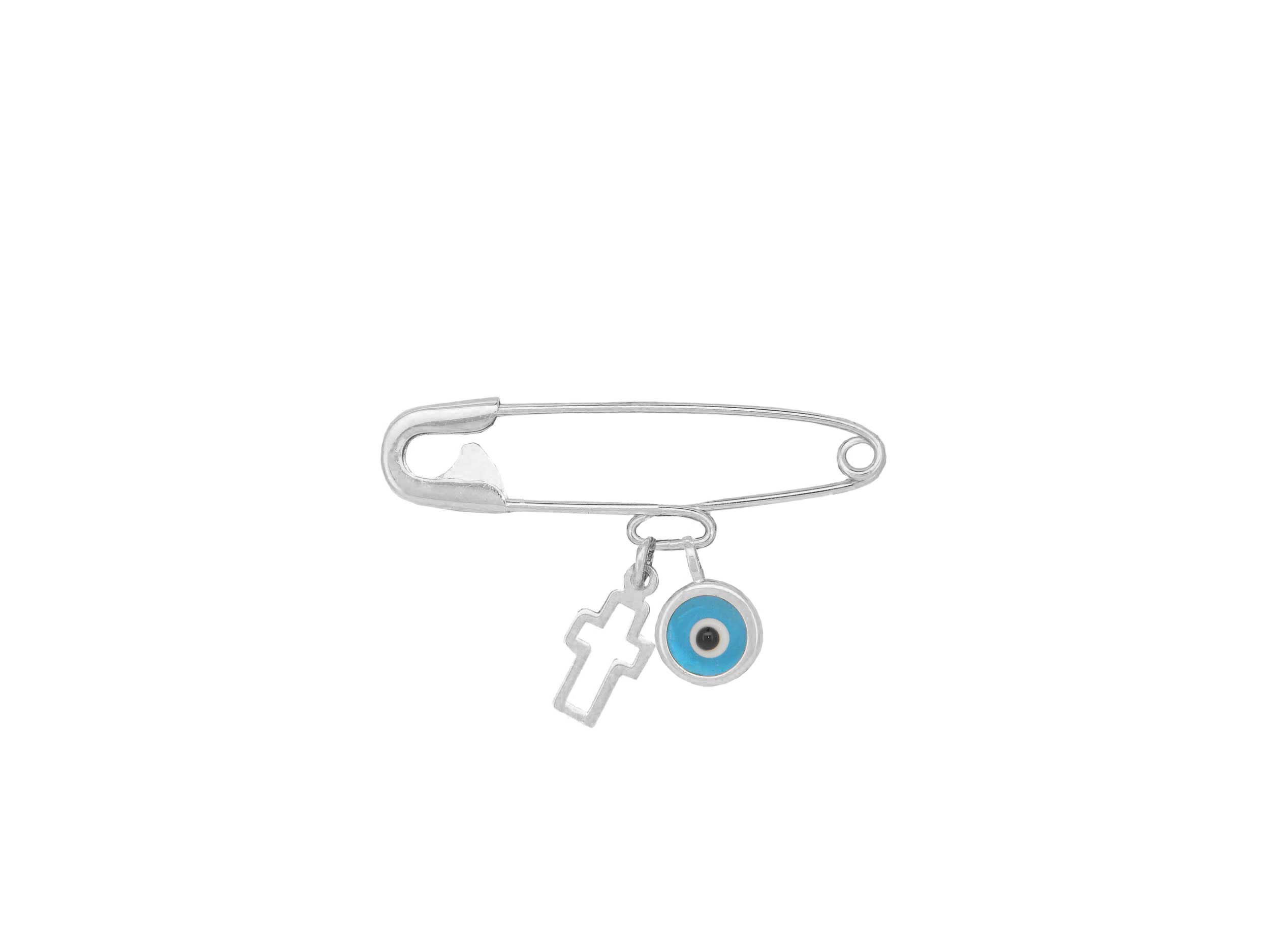 Unisex λευκόχρυση παραμάνα για νεογέννητο 14 Καράτια, με λουστρέ φινίρισμα. Κοσμείται με κρεμαστά στοιχεία, ένα σταυρουδάκι και ένα ματάκι. Υπέροχη επιλογή δώρου για γέννηση ή βάπτιση.