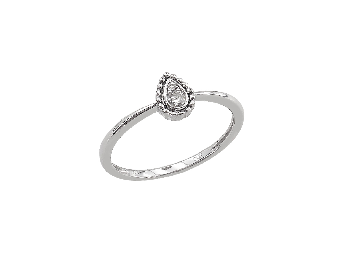 Γυναικείο λευκόχρυσο δαχτυλίδι δάκρυ 18 Καρατίων, με λουστρέ φινίρισμα, διακοσμημένο με δύο διαμάντια κοπής brilliant. Κομψό και φινετσάτο κόσμημα με υπέροχη λάμψη που θα συνοδεύει κάθε σας εμφάνιση!