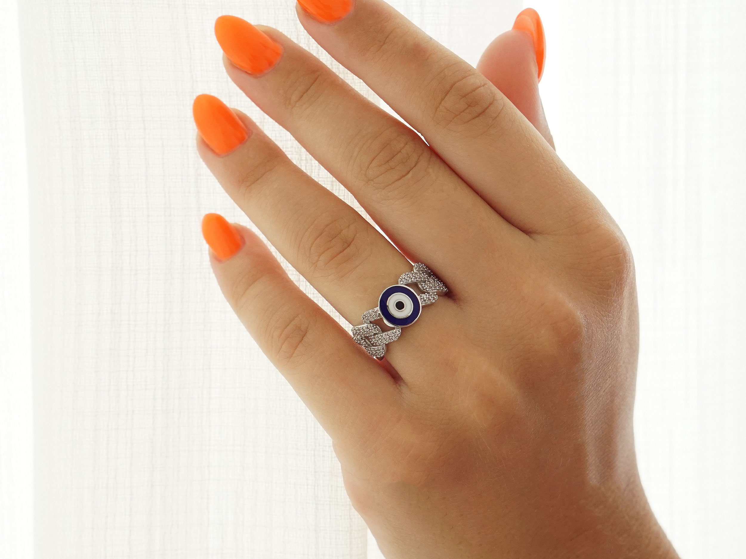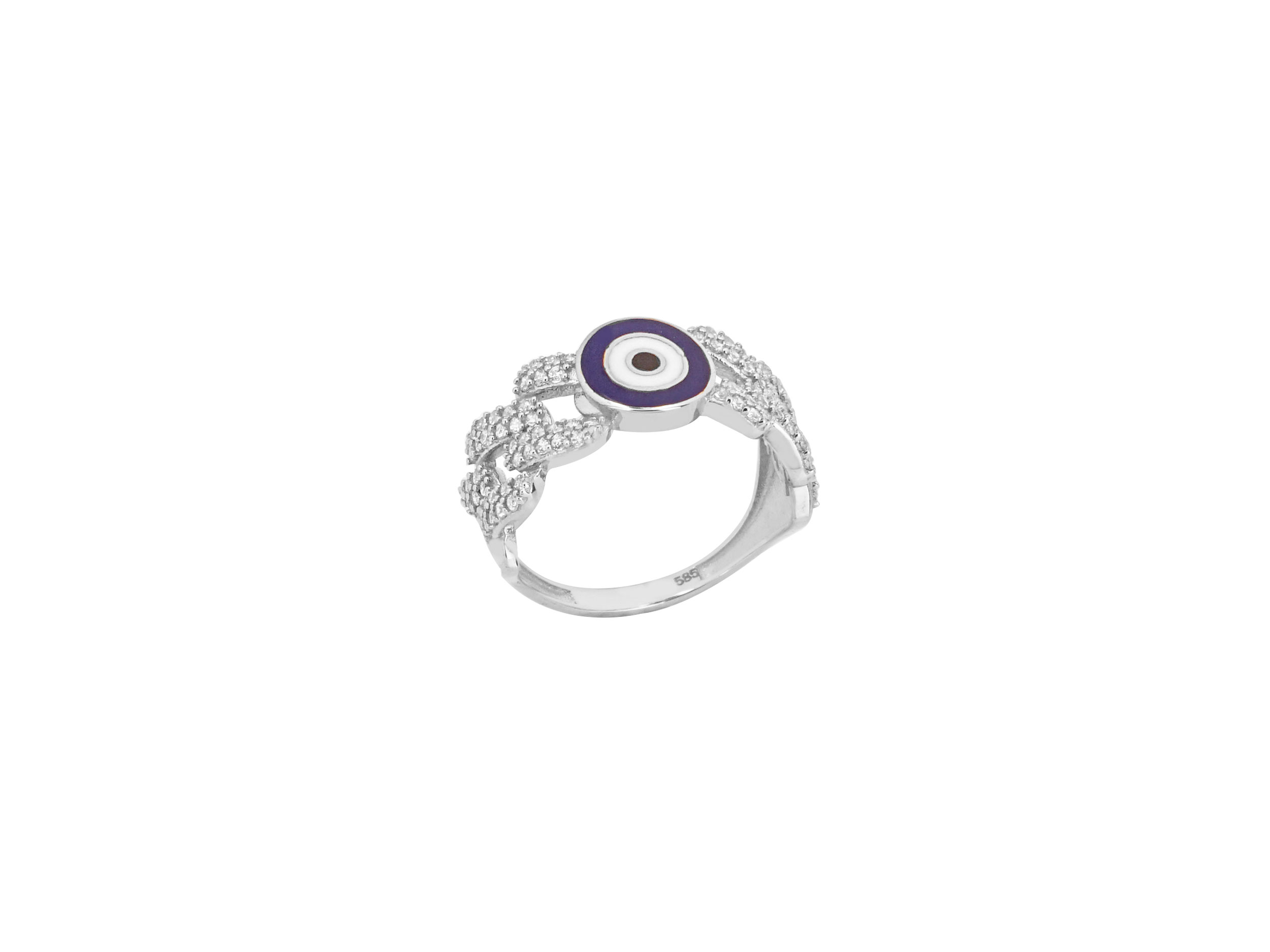 Υπέροχο λευκόχρυσο δαχτυλίδι ματάκι 14 Καρατίων, με λουστρέ φινίρισμα. Κοσμείται με ένα ματάκι από λευκό, μπλε και μαύρο σμάλτο και με λευκές cubic ζιργκόν πέτρες. Κομψό και λαμπερό κόσμημα που θα φοράτε καθημερινά!