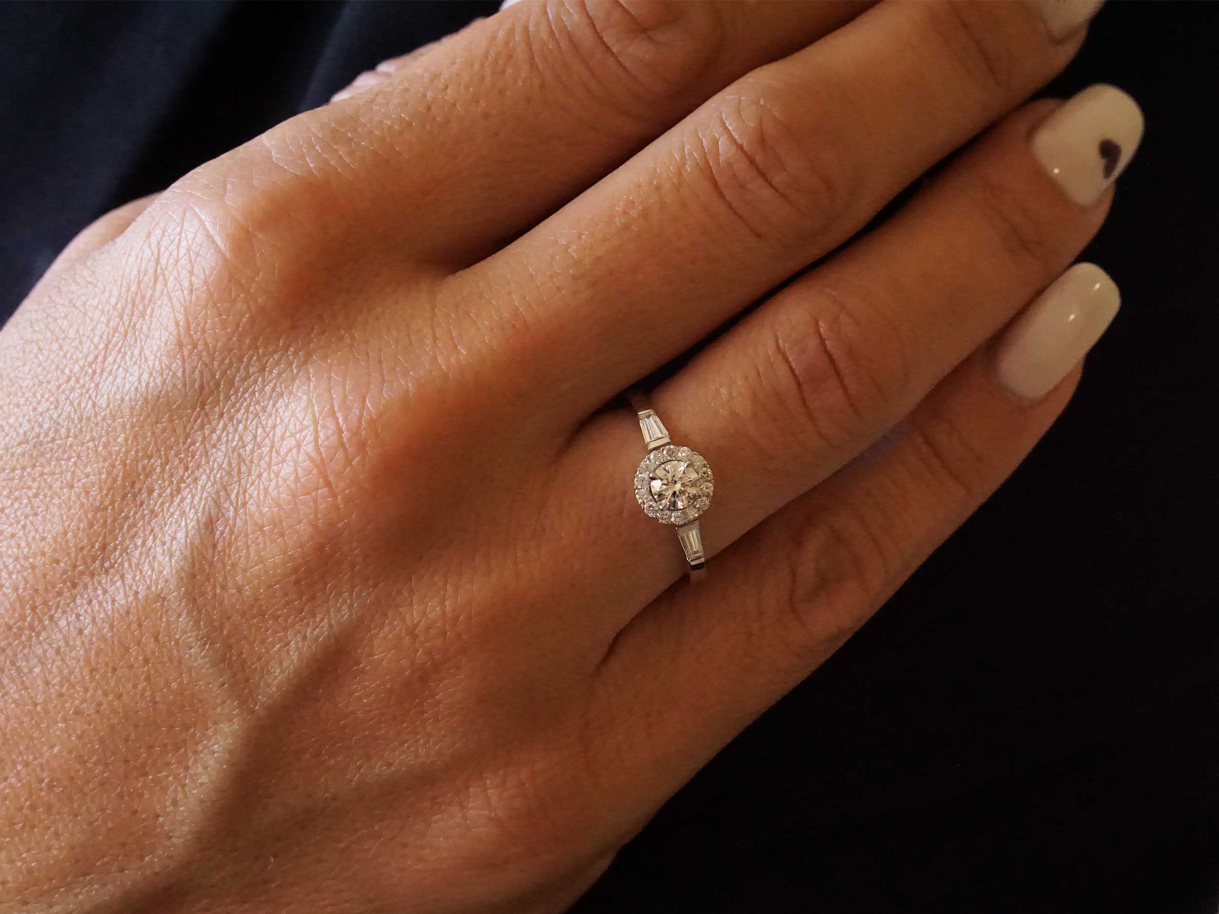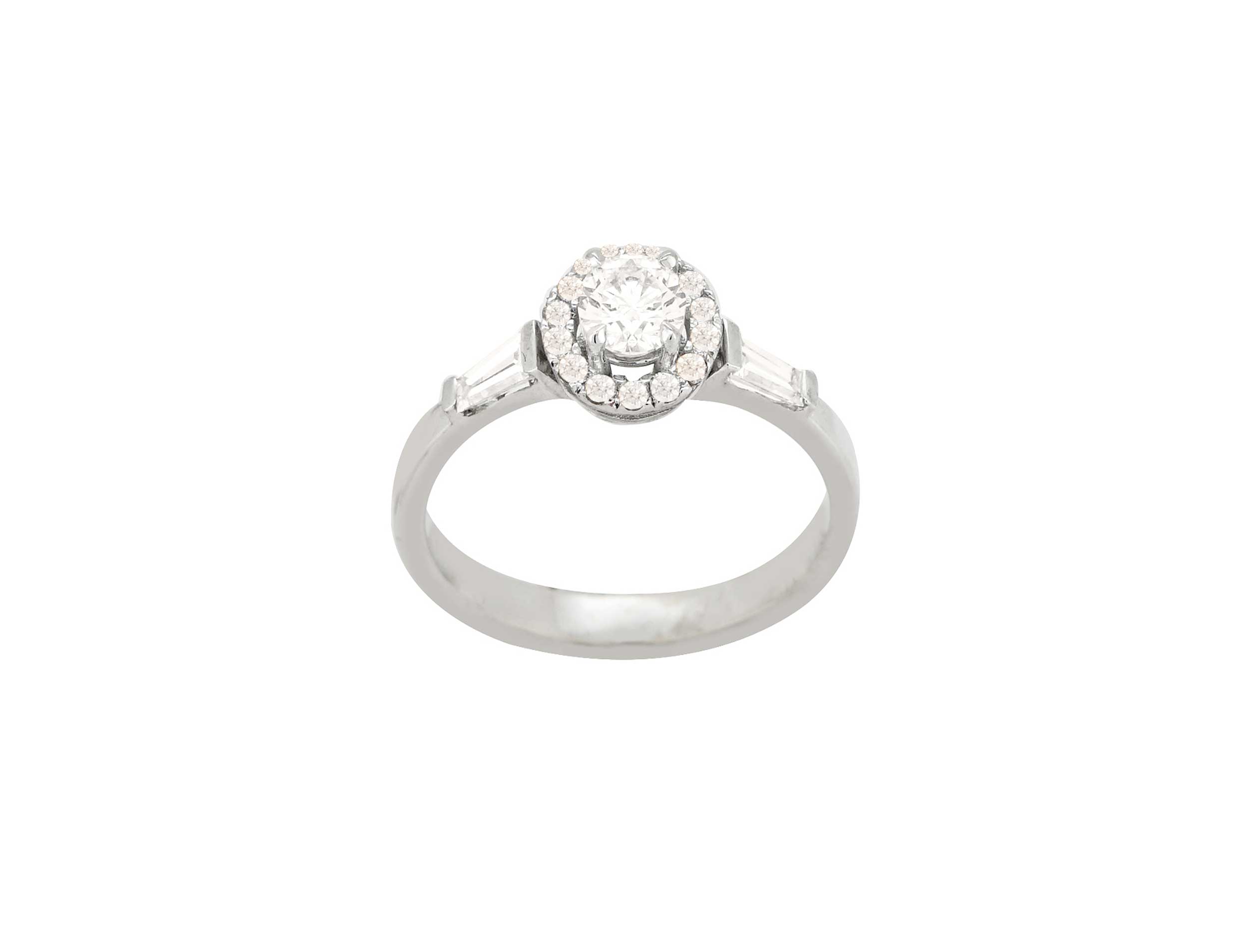 Λαμπερό λευκόχρυσο δαχτυλίδι ροζέτα 18 Καρατίων, με λουστρέ φινίρισμα. Μια εντυπωσιακή ροζέτα που κοσμείται με μια κεντρική πέτρα κοπής round brilliant 0,40 ct, περιμετρικά με 14 διαμάντια 0,18 ct ενώ αριστερά και δεξιά υπάρχουν συνολικά 2 taper baguette cut 0,28 ct. Ένα εκθαμωτικό δαχτυλίδι δημιουργώντας ένα κόσμημα ιδανικό για κάθε ξεχωριστή στιγμή!