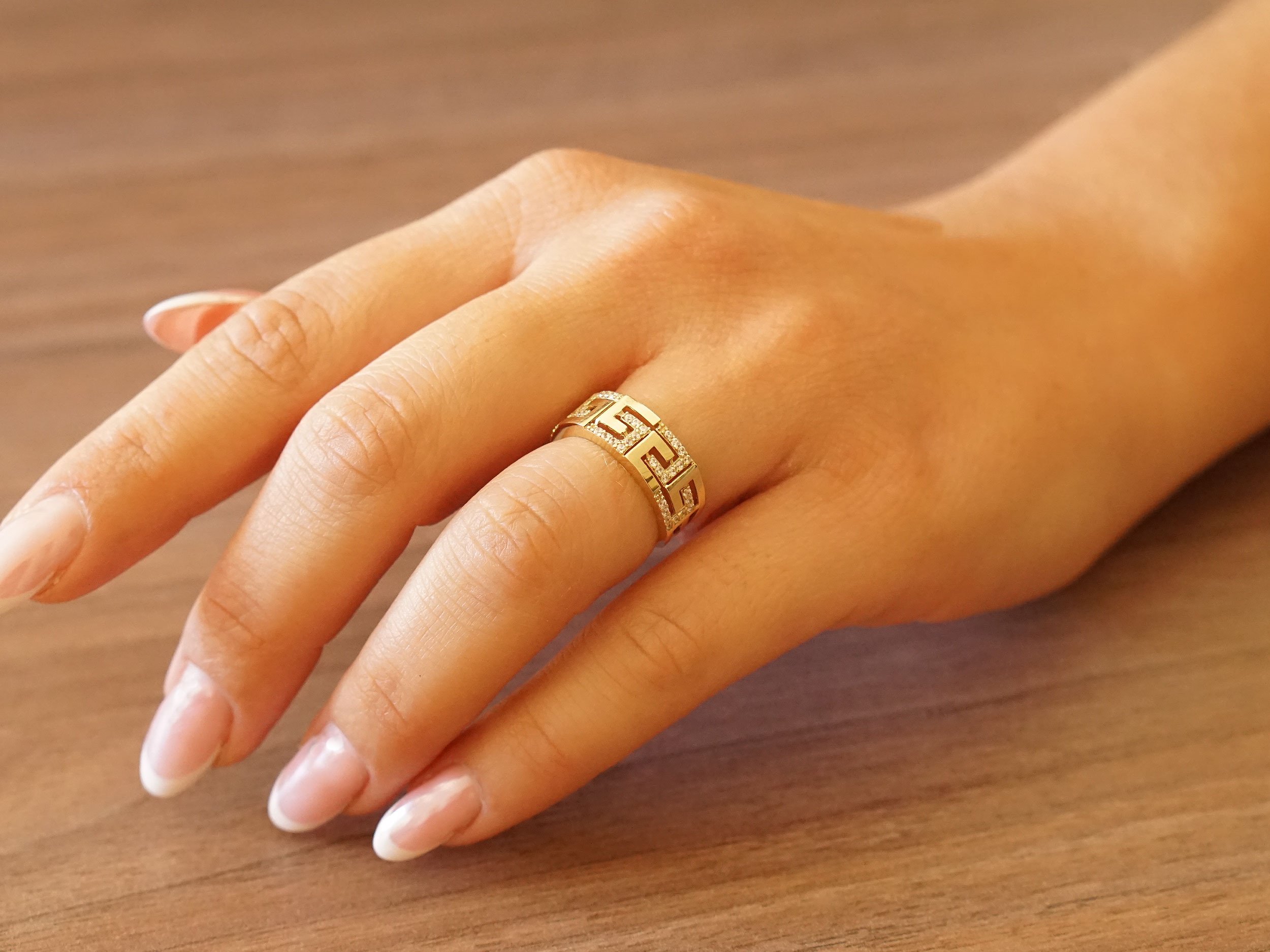 Μαίανδρος δαχτυλίδι, κατασκευασμένο από χρυσό 9 Καρατίων, με λουστρέ φινίρισμα. Κοσμείται από λαμπερές cubic ζιργκόν πέτρες σε λευκό χρώμα και από το διαχρονικό μοτίβο των μαιάνδρων.