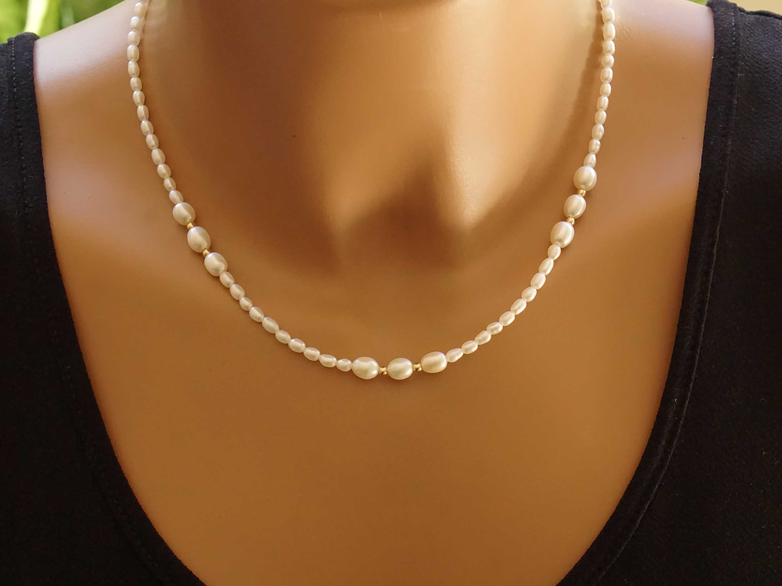 Μαργαριταρένιο κολιέ με χρυσό κούμπωμα 14Κ. Κοσμείται με κομψά fresh water pearls 3 x 5 mm, με 9 μεγαλύτερα μαργαριτάρια 5 x 7 mm και με 6 λαμπερές χρυσές μπίλιες 14 Καρατίων 2,5 mm ενδιάμεσα. Αναδείξτε τη θηλυκότητά σας με τη γοητεία των φυσικών μαργαριταριών!