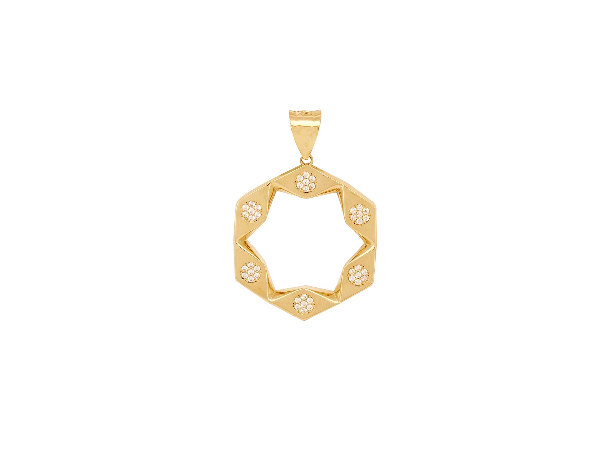 Εντυπωσιακό μενταγιόν χρυσό 14 Καράτια, με λουστρέ φινίρισμα. Έχει εξάγωνο σχήμα και κοσμείται με λαμπερές cubic ζιργκόν πέτρες σε λευκό χρώμα. Το συνολικό μήκος του είναι 3,70 cm. Συνδυάστε το με μια χρυσή αλυσίδα 14Κ.