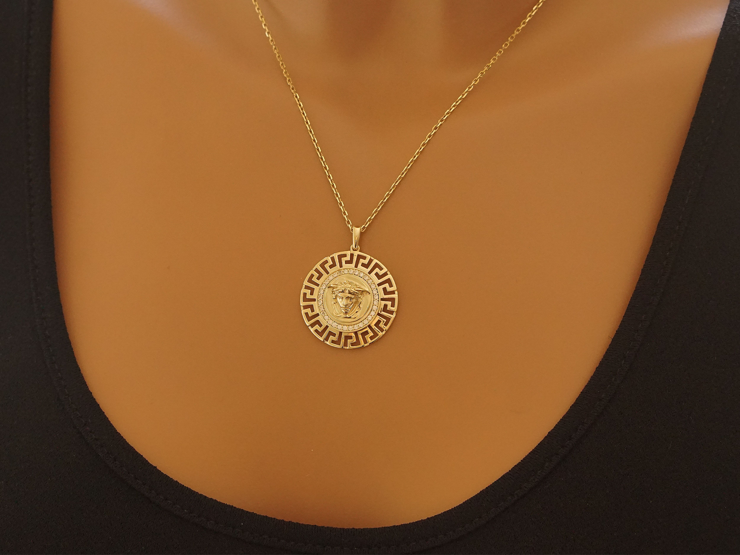 Μενταγιόν χρυσό 9 Καράτια, με λουστρέ φινίρισμα. Αποτελείται από ένα κυκλικό μοτίφ διακοσμημένο με ανάγλυφο σχέδιο στο κέντρο και περιμετρικά με λευκές cubic ζιργκόν πέτρες και διάτρητους μαιάνδρους. Το συνολικό μήκος του με τον κρίκο είναι 3,00 cm. Ένα εντυπωσιακό κόσμημα που μπορείτε να φορέσετε με μια χρυσή αλυσίδα.