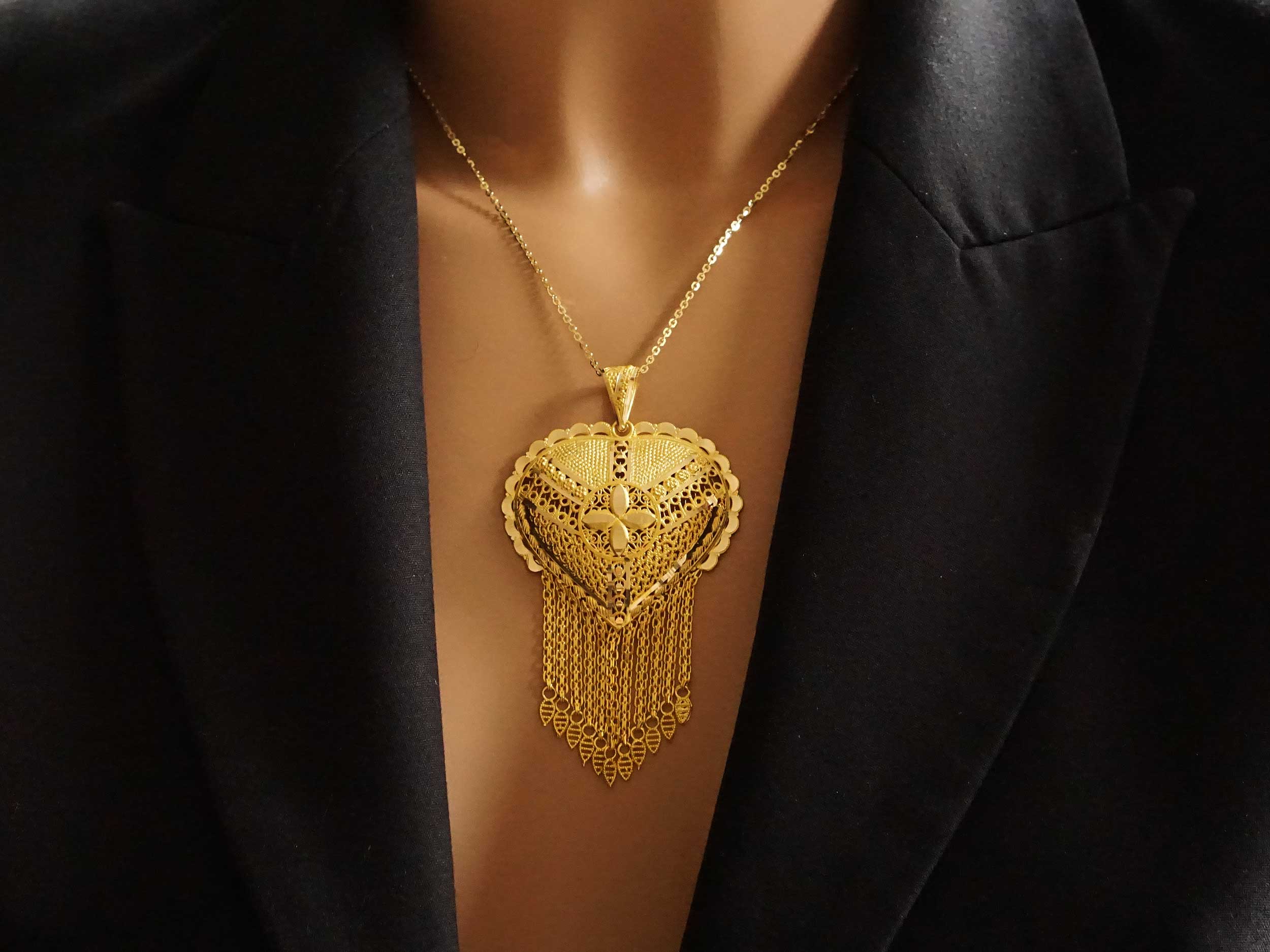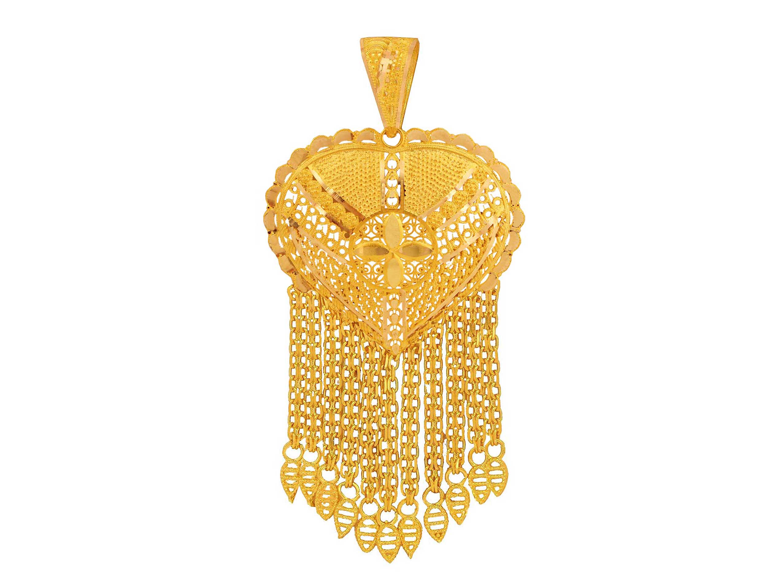 Μενταγιόν χρυσό χειροποίητο 14 Καρατίων. Ένα εντυπωσιακό μενταγιόν καρδιά με αλυσίδες και υπέροχα ανάγλυφα και διάτρητα σχέδια, σε μοναδικό ινδικό στιλ. Έχει λουστρέ φινίρισμα και λεπτομέρειες με διαμαντάρισμα. Το συνολικό μήκος του με τον κρίκο είναι 7,60 cm.