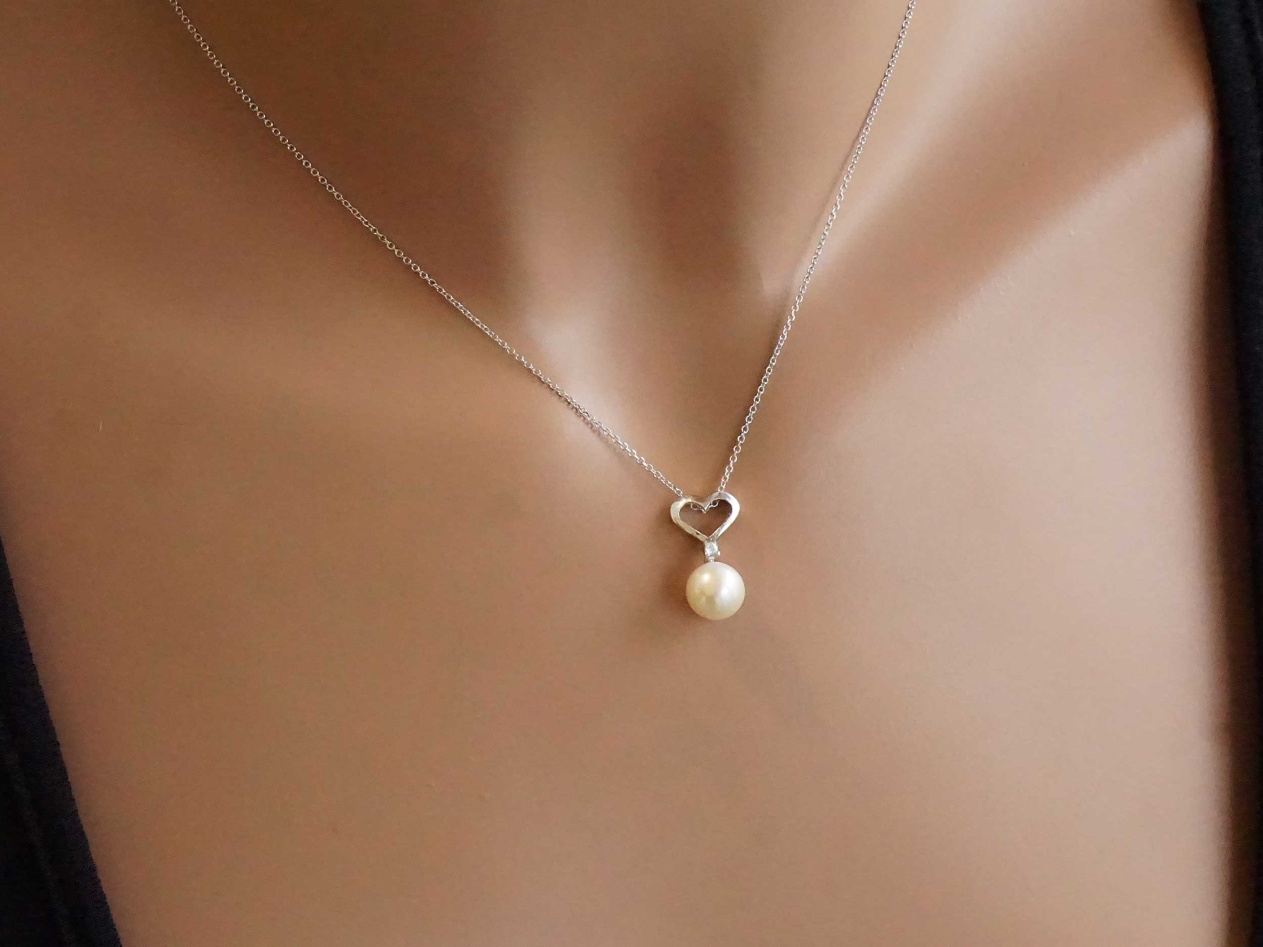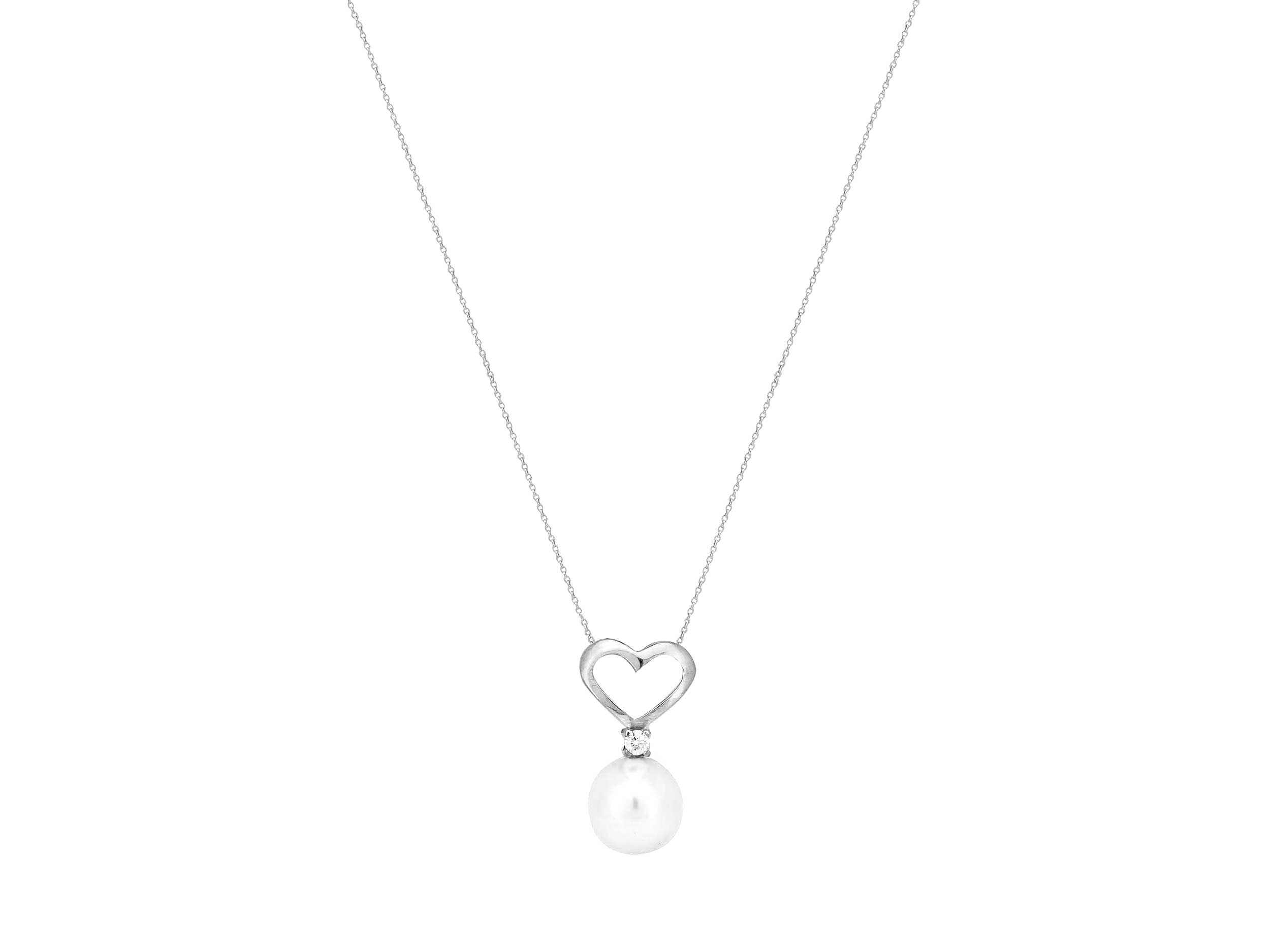 Μενταγιόν καρδιά λευκόχρυσο 18 Καράτια, διακοσμημένο με ένα λαμπερό διαμάντι round brilliant cut και με ένα υπέροχο λευκό μαργαριτάρι. Συνοδεύεται από λευκόχρυση αλυσίδα 18Κ, μήκους 40,00 cm.