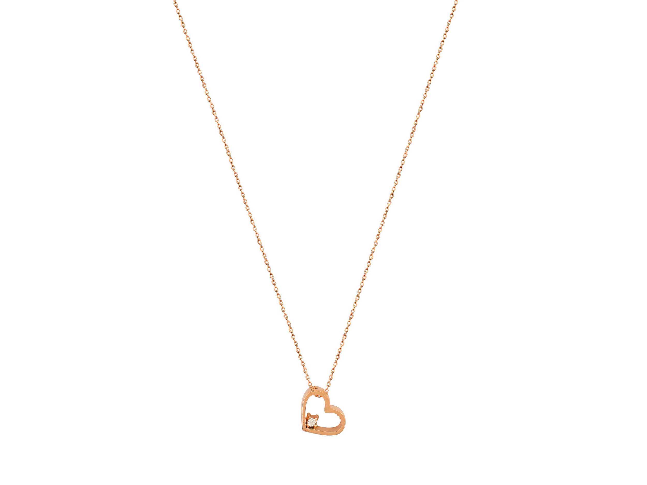 Μενταγιόν καρδιά με αλυσίδα, σε ροζ χρυσό 18 Καρατίων. Η καρδιά έχει λουστρέ φινίρισμα και είναι διακοσμημένη με ένα υπέροχο και λαμπερό μπριγιάν. Μοναδική επιλογή για να απογειώσετε μια ρομαντική εμφάνιση!
