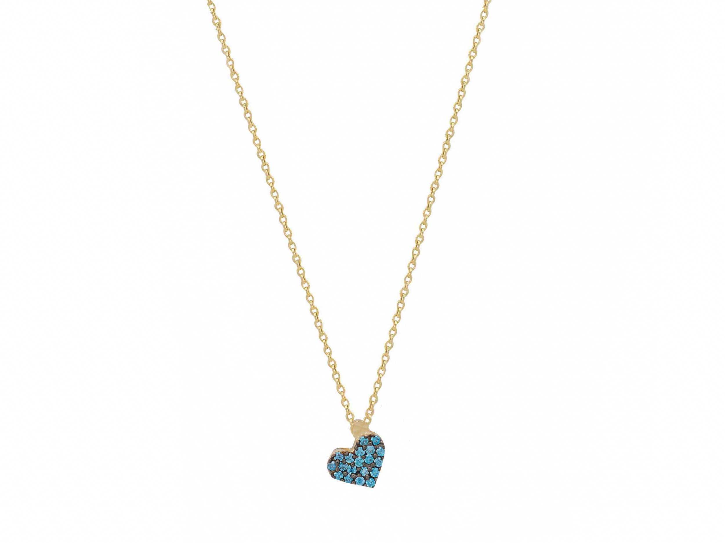 Μενταγιόν καρδούλα χρυσή 9 Καρατίων, με αλυσίδα μήκους 40,00 cm. Κοσμείται με λαμπερές τιρκουάζ cubic ζιργκόν πέτρες σε καστόνια με μαύρο επιπλατίνωμα. Υπέροχη επιλογή δώρου για το αγαπημένο σας πρόσωπο!