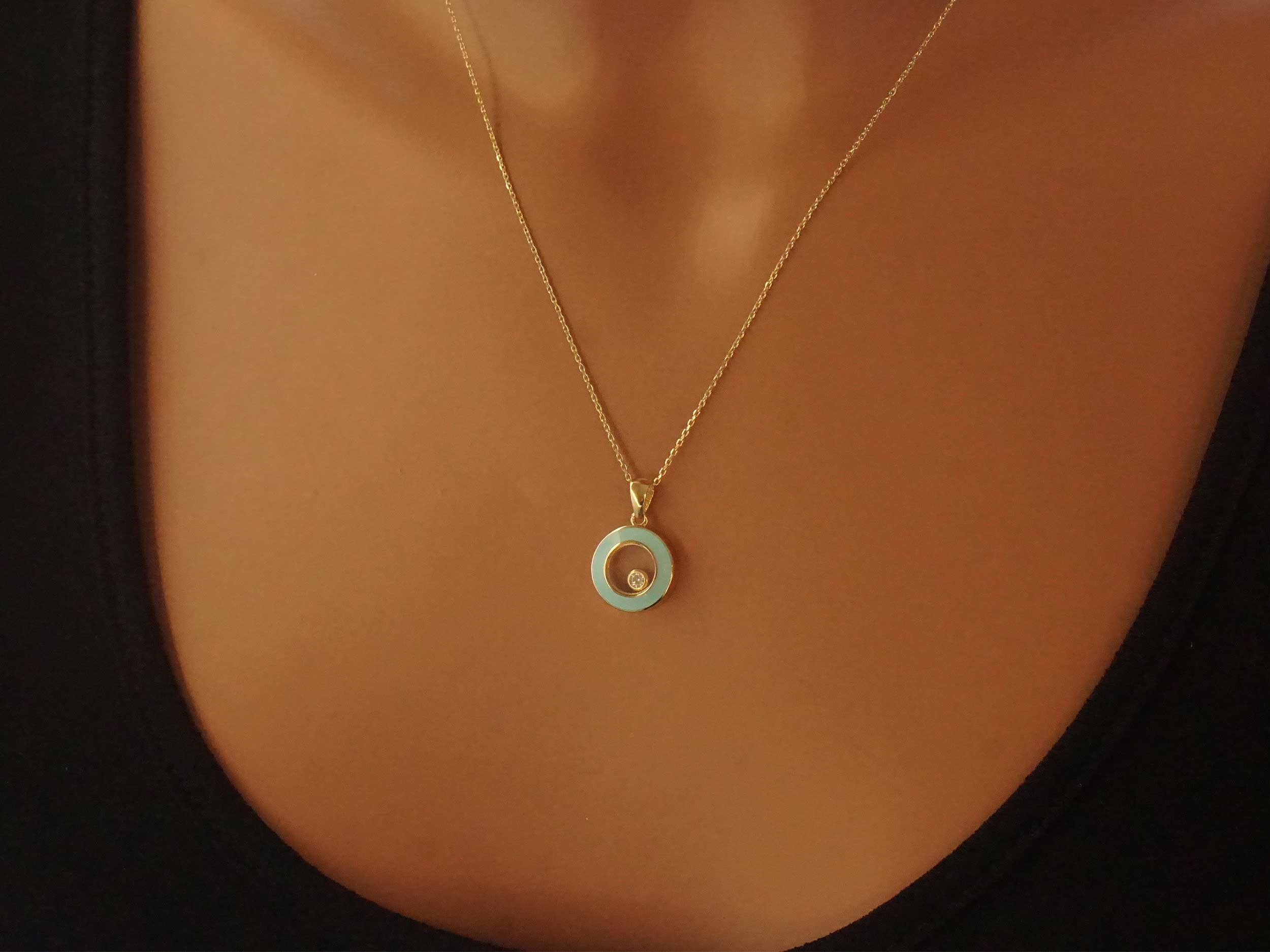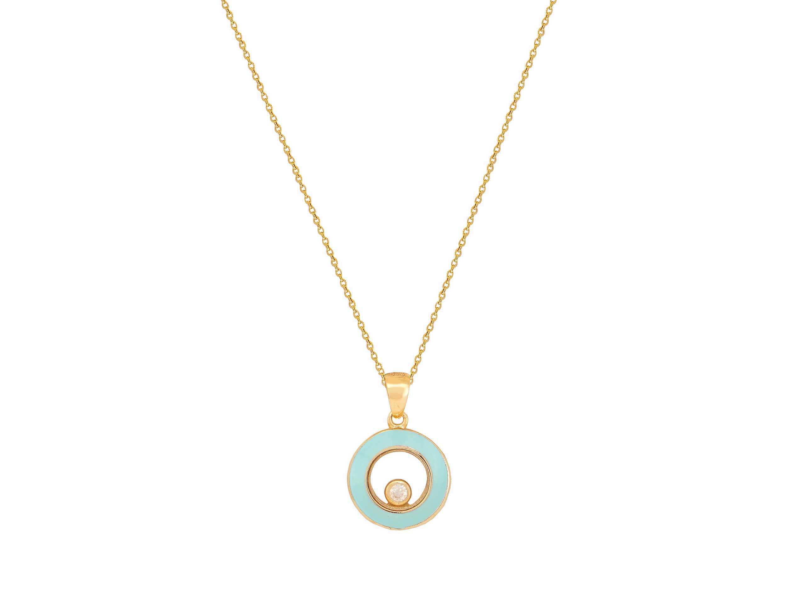 Μοντέρνο γυναικείο μενταγιόν, 14Κ. Το συνολικό μήκος μαζί τον κρίκο είναι 1,70 cm. Το μέταλλο του έχει λουστρέ φινίρισμα και κεντρικά είναι τοποθετημένο ένα λαμπερό cubic ζιργκόν, σε λευκό χρώμα. Περιμετρικά υπάρχει σμάλτο σε τιρκουάζ χρώμα. Ιδανικό για παιχνιδιάρικα λουκ.