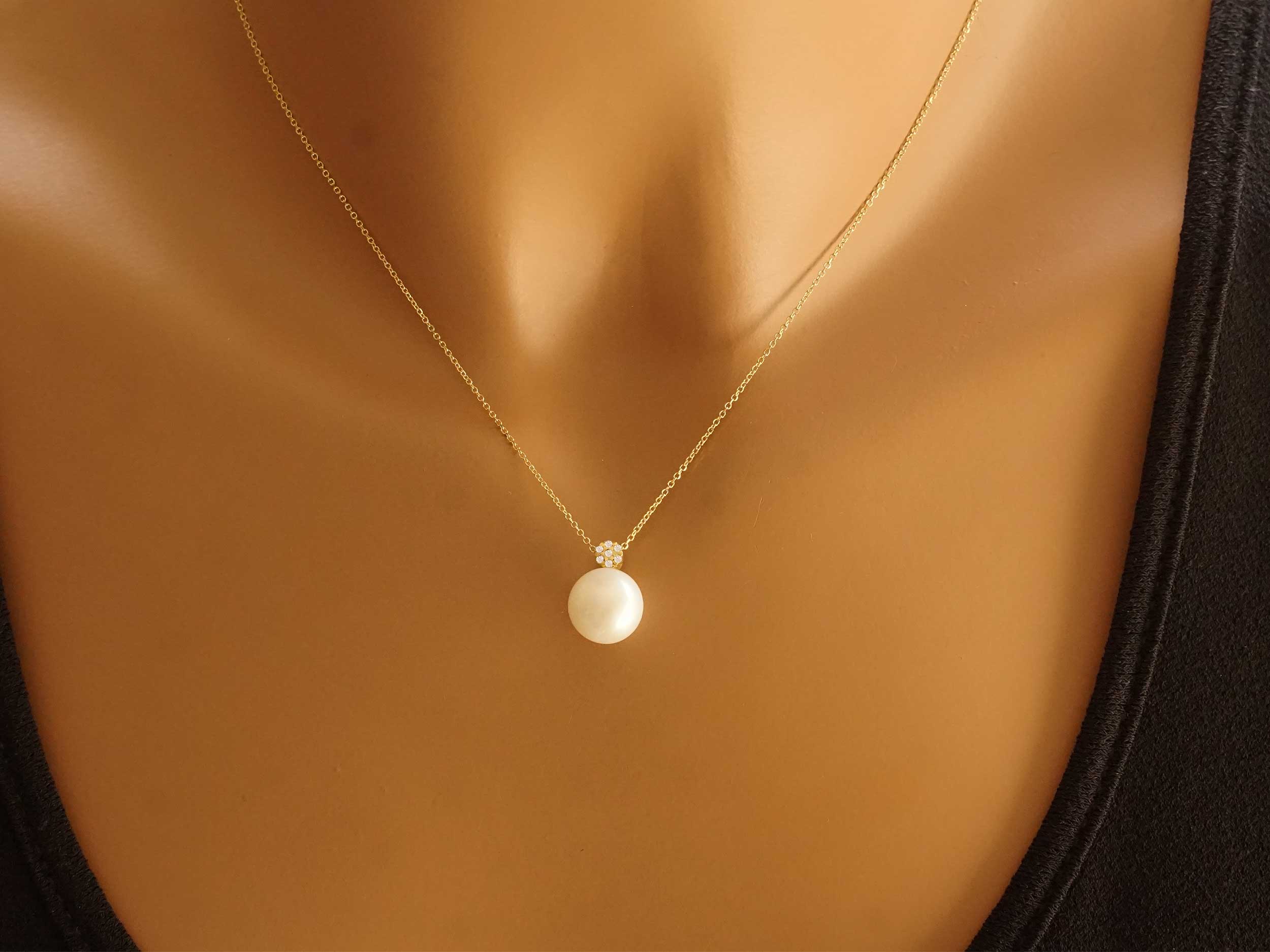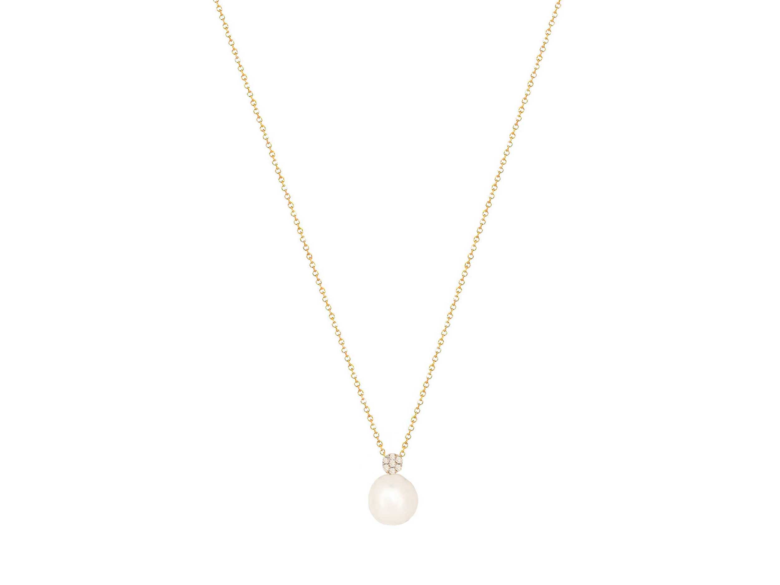Μενταγιόν με μαργαριτάρι και διαμάντια, σε χρυσό 18 Καρατίων. Κοσμείται με μια κομψή ροζέτα με επτά λαμπερά διαμάντια κοπής round brilliant και με ένα εντυπωσιακό, λευκό μαργαριτάρι. Συνοδεύεται από χρυσή αλυσίδα 18Κ, μήκους 40,00 cm.