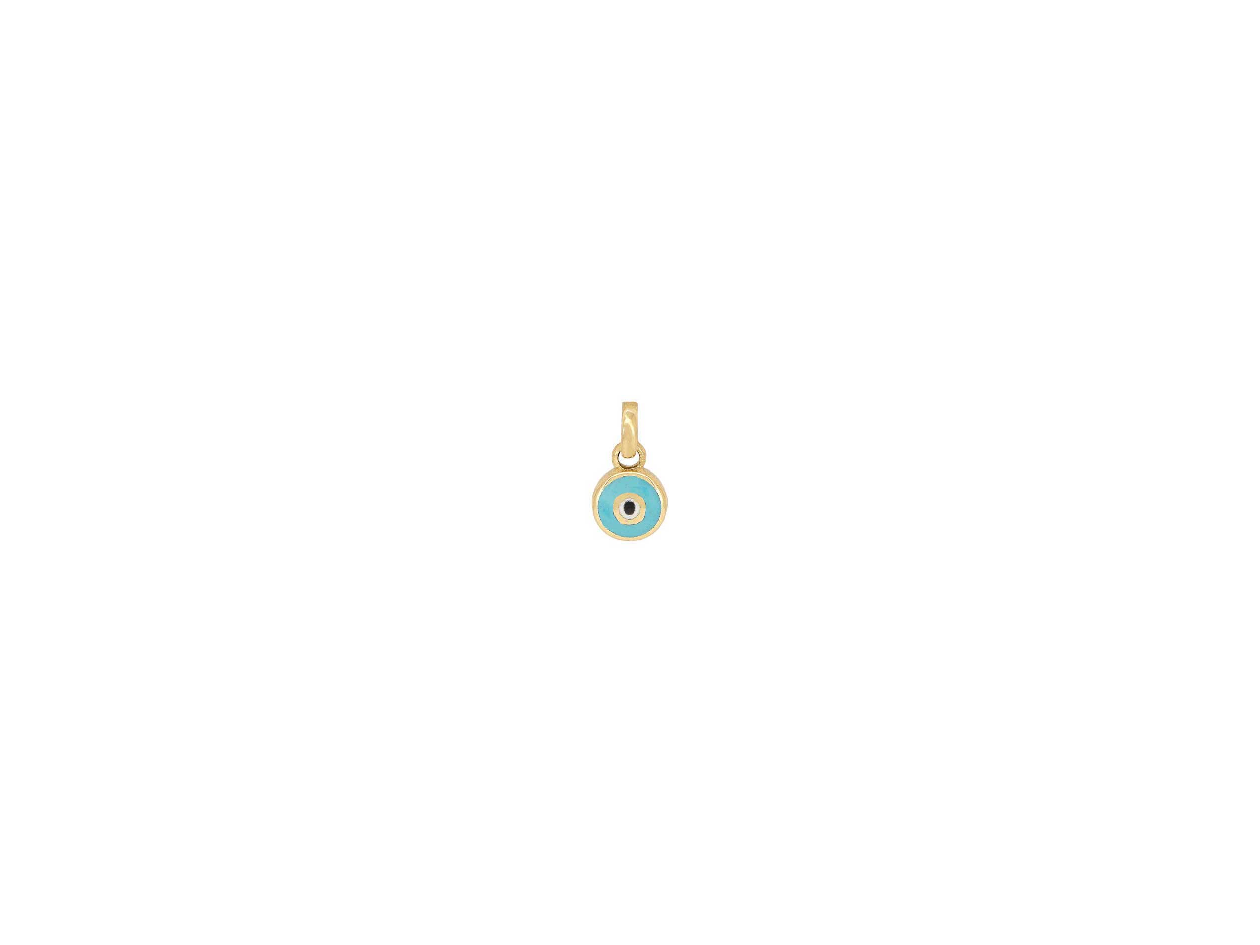 Μενταγιόν ματάκι χρυσό 14 Καράτια, με λουστρέ φινίρισμα. Είναι διπλής όψης και κοσμείται από τη μία πλευρά με γαλάζιο και από την άλλη με μπλε σμάλτο. Το συνολικό του μήκος είναι 0,90 cm. Ιδανικό δώρο για κάθε ηλικία. Συνδυάστε το με μια χρυσή αλυσίδα 14Κ ή με μια παραμάνα.