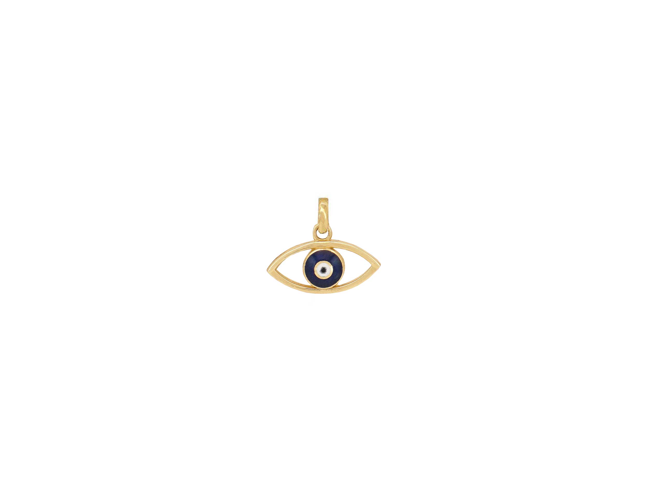 Μενταγιόν μάτι χρυσό 14Κ, διακοσμημένο με μπλε, λευκό και μαύρο σμάλτο. Έχει λουστρέ φινίρισμα και το συνολικό μήκος του με τον κρίκο είναι 1,20 cm. Ένα κομψό και διακριτικό κόσμημα που μπορεί να συνδυαστεί με μια χρυσή αλυσίδα 14Κ ή με μια παραμάνα.