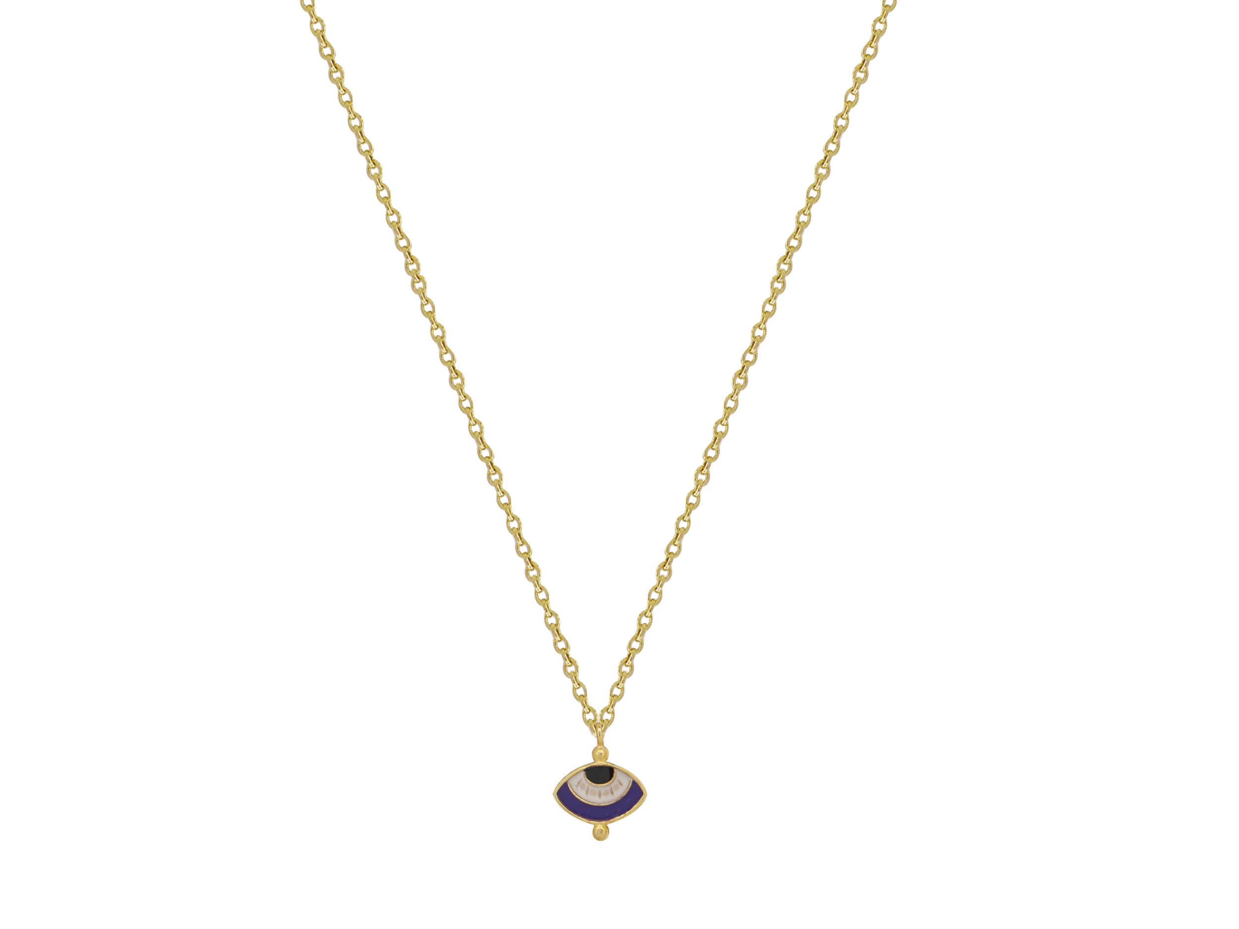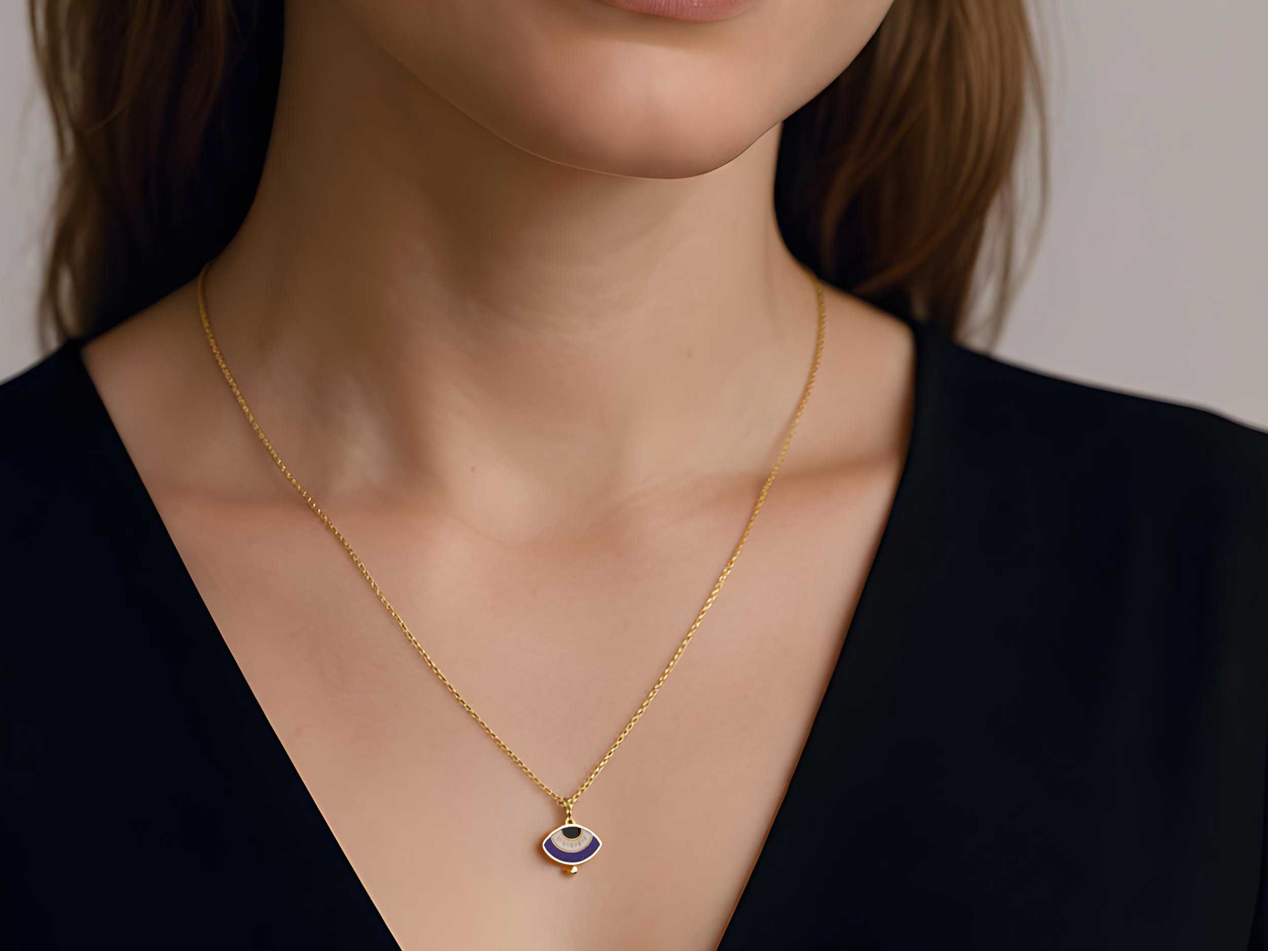 Μενταγιόν με μοβ μάτι, επιχρυσωμένο 925, διακοσμημένο με σμάλτο σε μαύρο, μοβ και λευκό χρώμα. Το συνολικό μήκος της αλυσίδας είναι 41,00 cm. Διακριτικό μενταγιόν που μπορεί να φορεθεί σε κάθε πρωινή εμφάνιση.