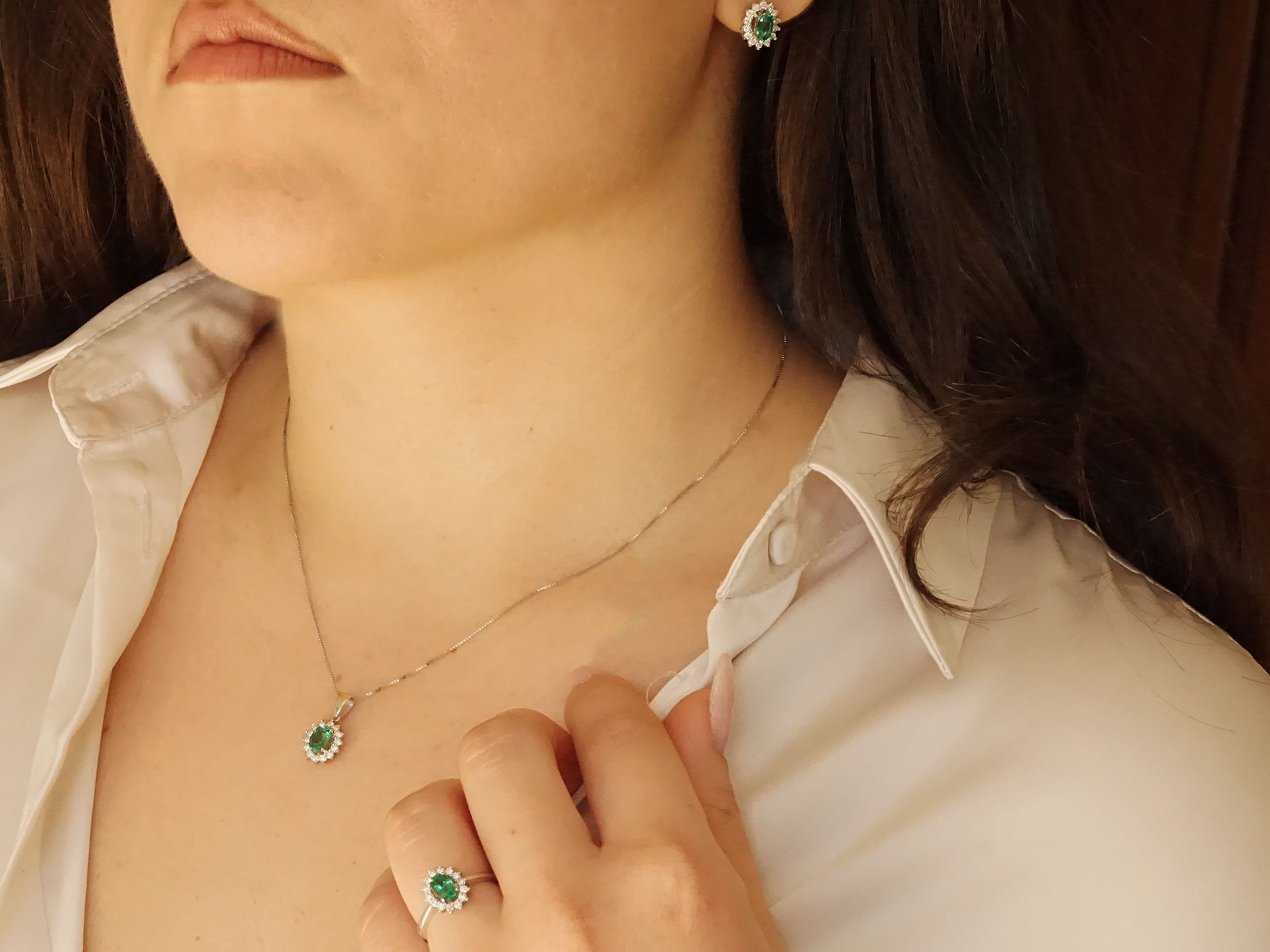 Μενταγιόν ροζέτα με πράσινη πέτρα και μπριγιάν, σε λευκόχρυσο 18 Καρατίων. Κοσμείται με έναν υπέροχο πράσινο γρανάτη στο κέντρο και με 14 λαμπερά διαμάντια round brilliant cut περιμετρικά. Το συνολικό μήκος του με τον κρίκο είναι 1,80 cm. Συνοδεύεται από λευκόχρυση βενετσιάνα αλυσίδα 18Κ. Συνδυάζεται μοναδικά με τα σκουλαρίκια και το δαχτυλίδι της ίδιας σειράς.